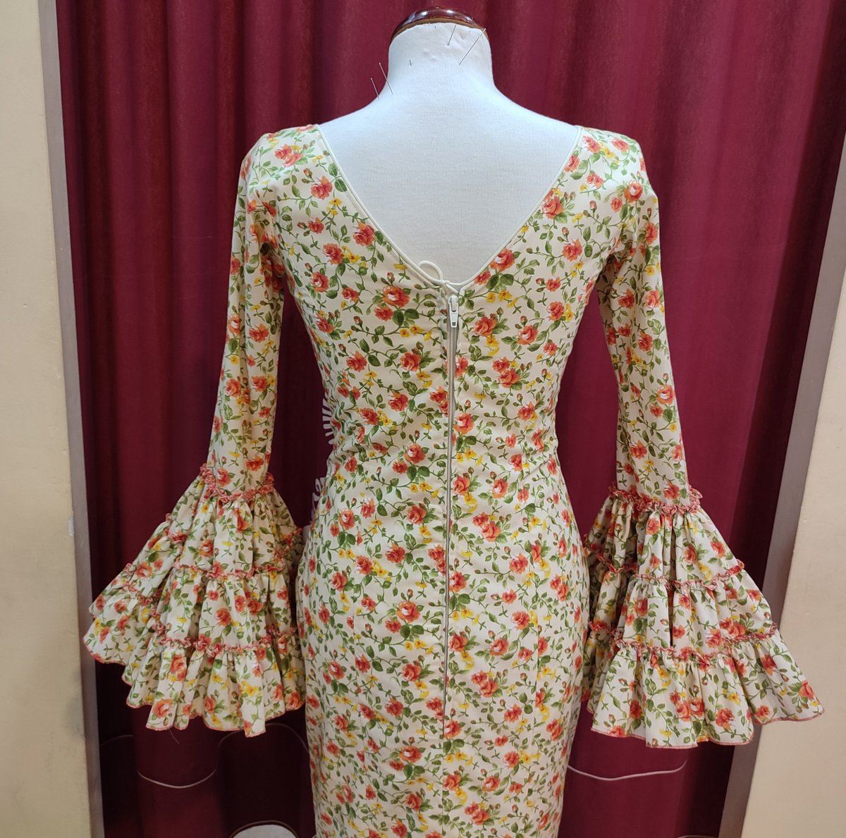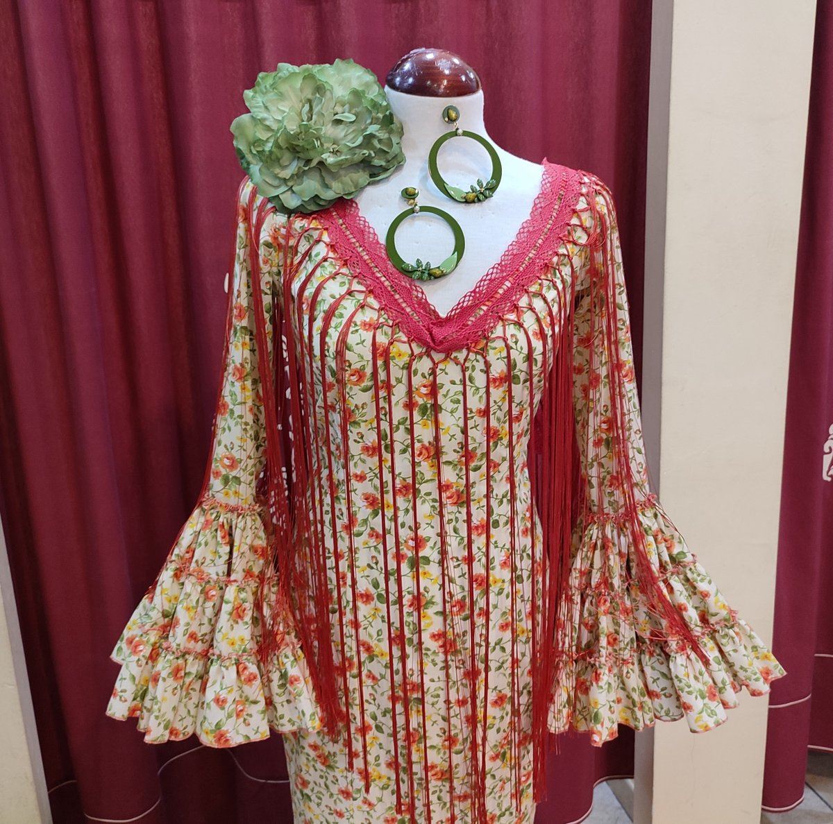 Canastero confeccionado en estampado de rosas en colores naranjas y verdes, sobre fondo beige.