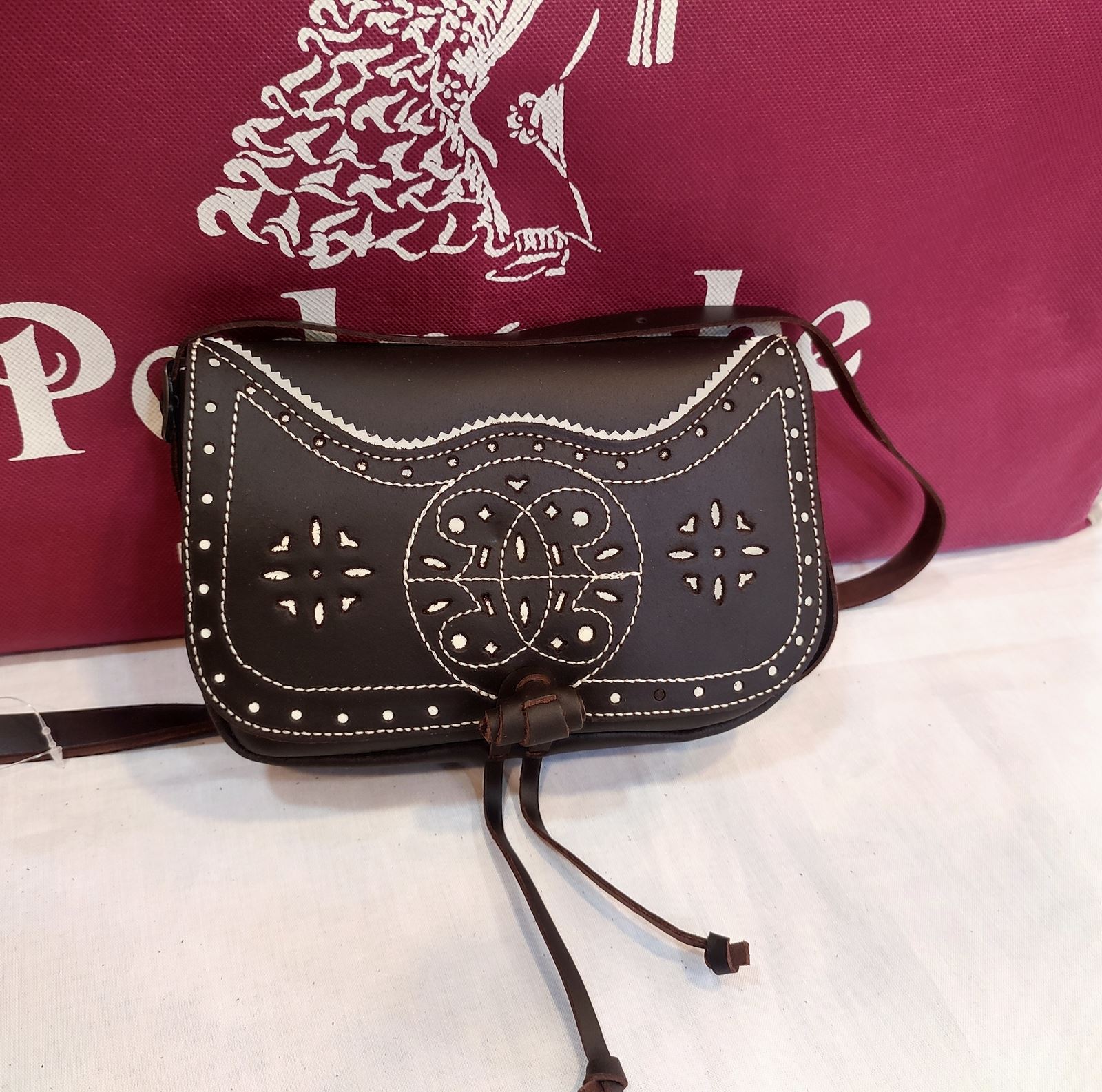 Bolso rociero para mujer. Bolso campero fabricado en piel natural picada. Se puede colocar como bandolera en cinturon. Adorno en piel en formas espejo.