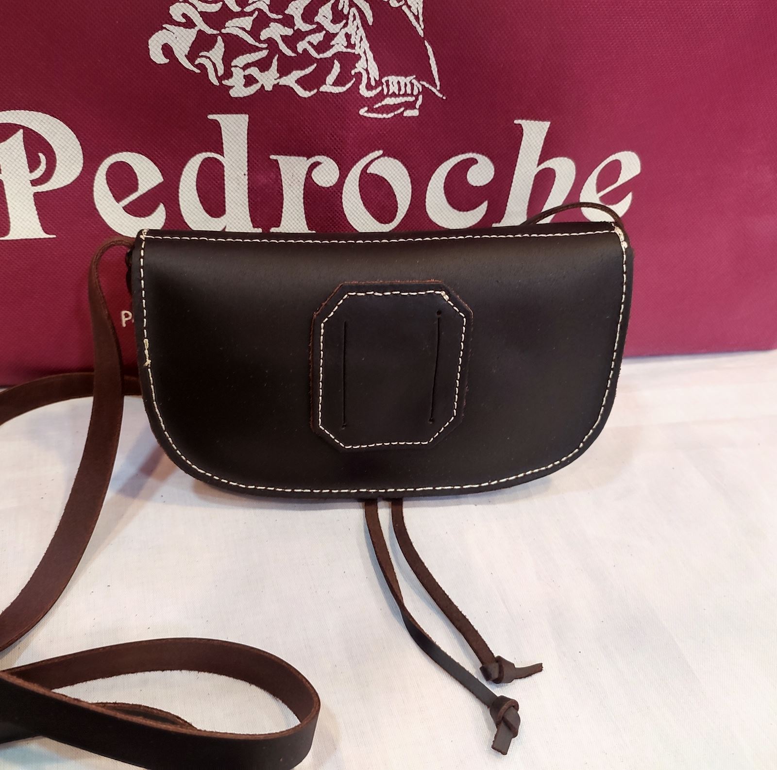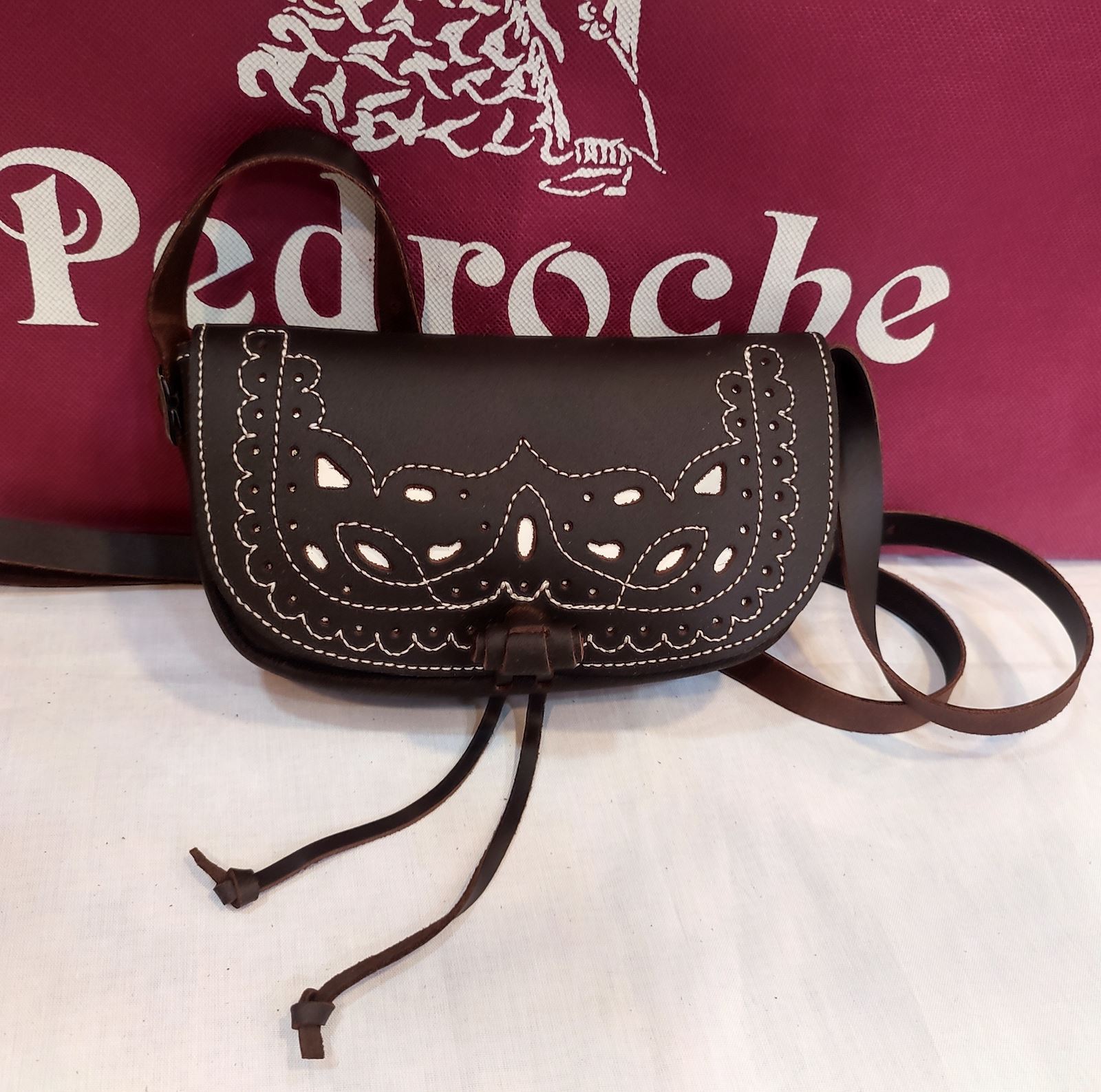 Bolso rociero para mujer. Bolso campero fabricado en piel natural picada. Se puede colocar como bandolera en cinturon. Adorno en piel en formas de olas.