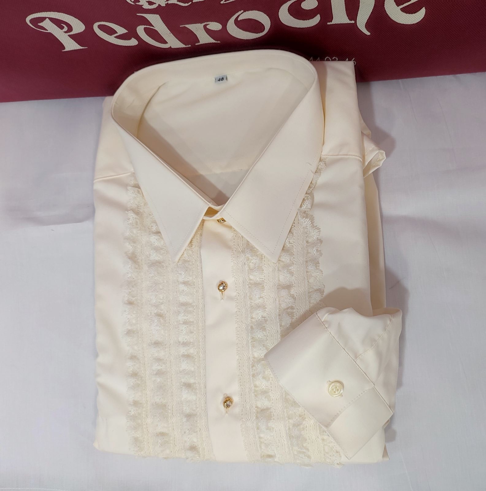 Camisa estilo campero para adulto. Confeccionada en color beige. Adorno central de jareta con tira bordada con 3 volantes. Manga larga con puño, Botones dorados.