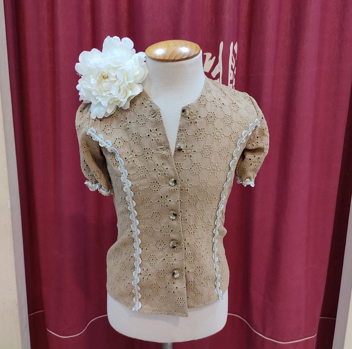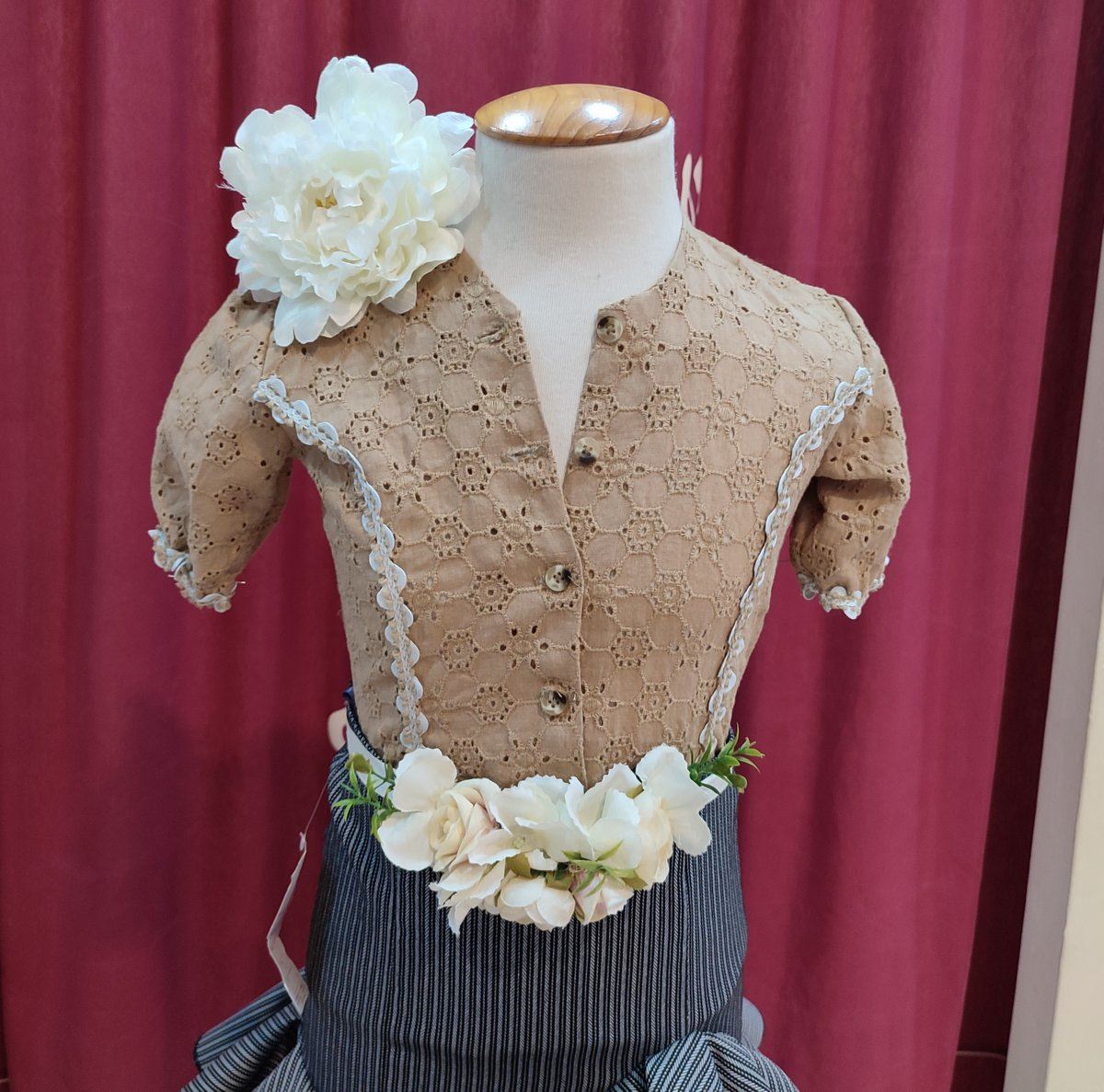 Camisa de flamenca para niña. Blusa confeccionada en tejido perforado. Color camel. Adornos de ondulinas en celeste. Manga corta abullonada.