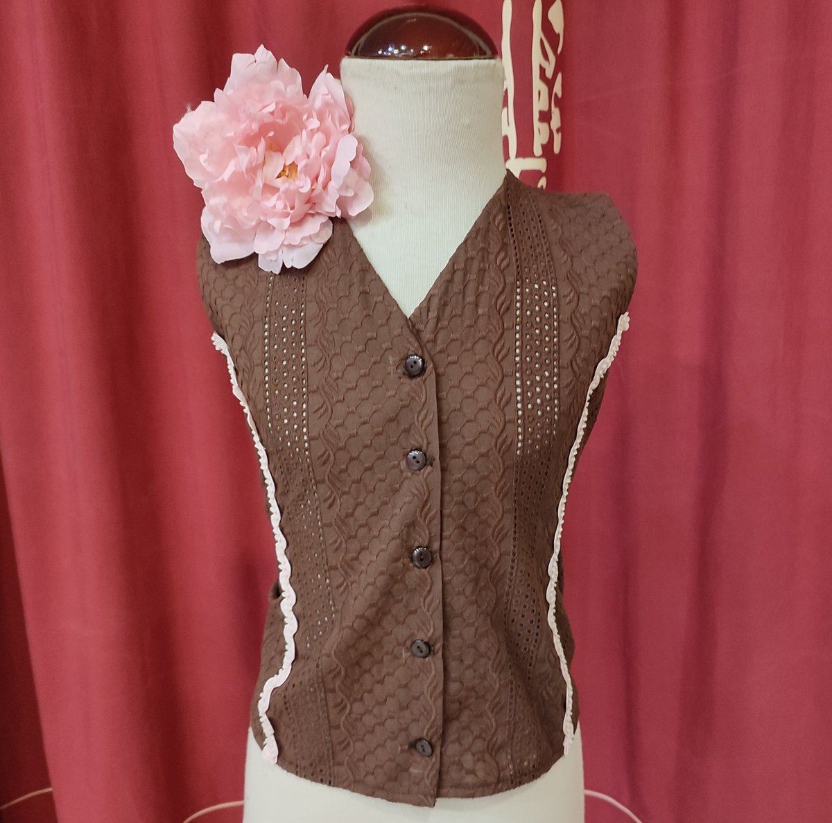 Camisa de manga sisa en perforado marron con adornos en rosa bebe.