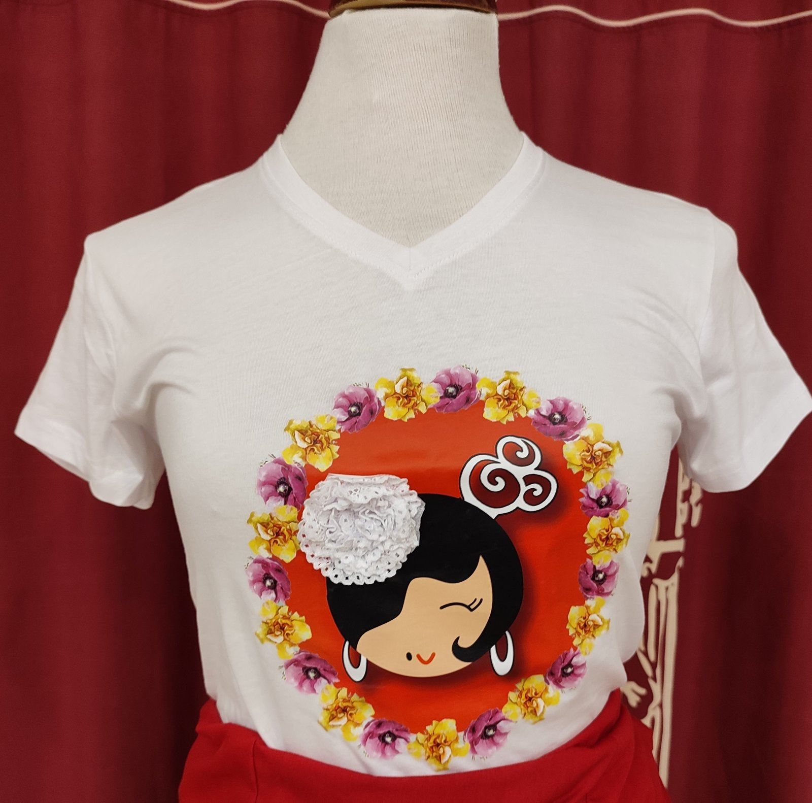 Camiseta de algodon blanca con adorno de flamenca sobre fondo rojo con adorno de flor en blanco y flores en rosa y amarillo.