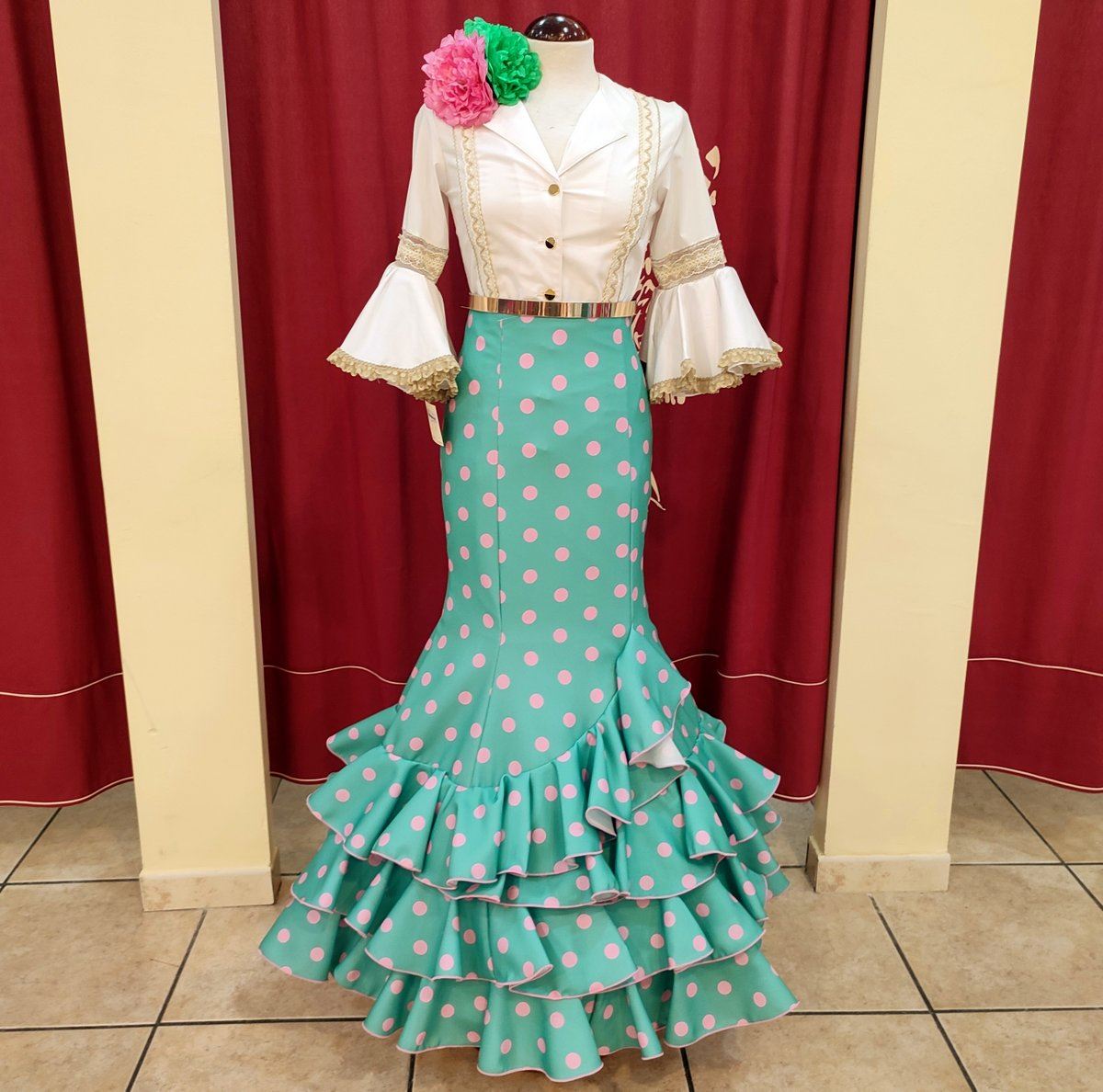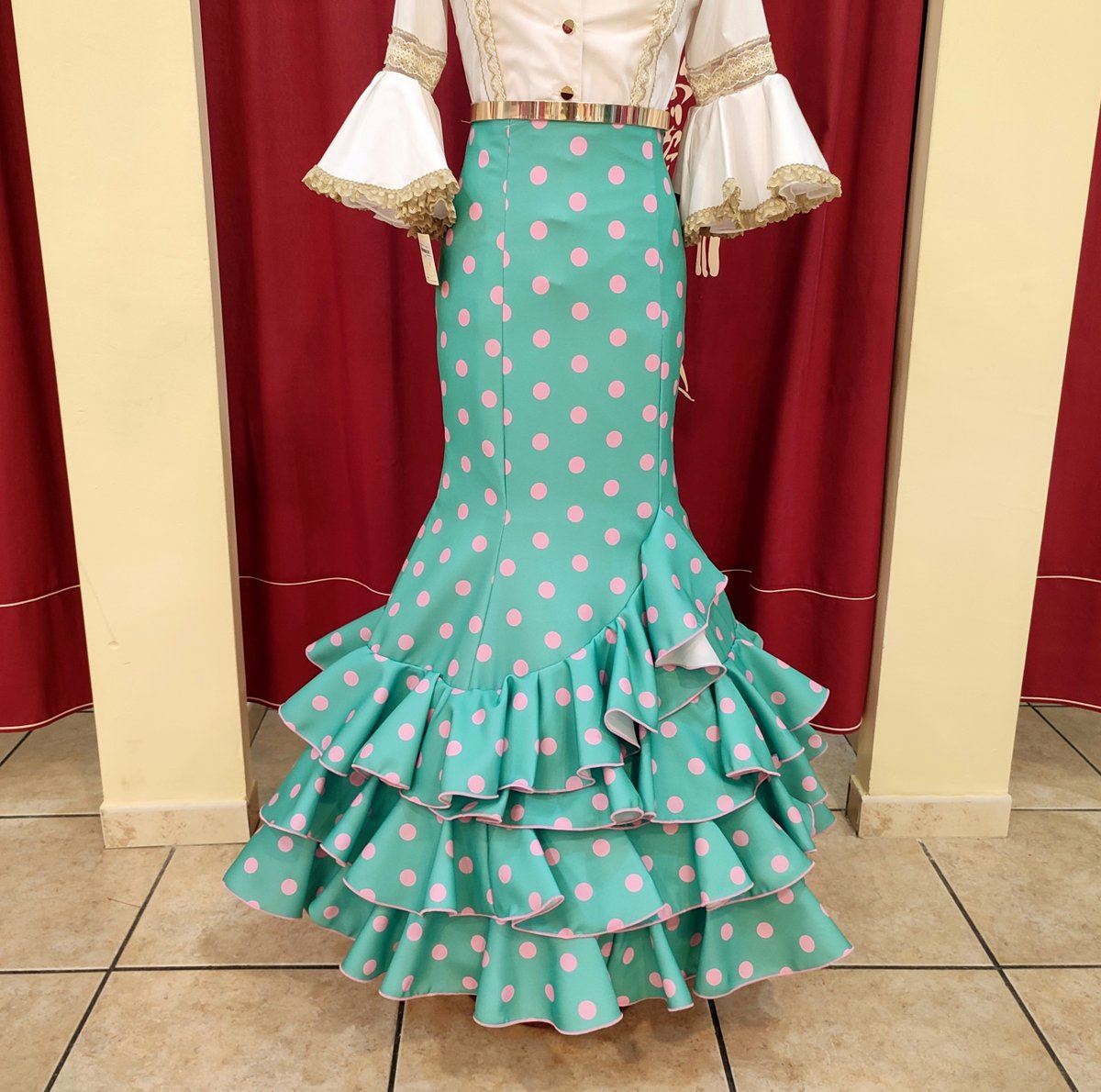 Falda confeccionada en tela de strech en verde agua con lunar rosa chicle.