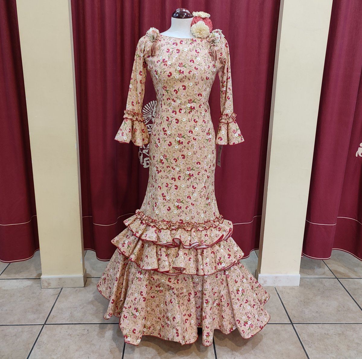 Canastero confeccionado en tela de popelin estampado en tonos rojos y calderas, sobre fondo tostado.