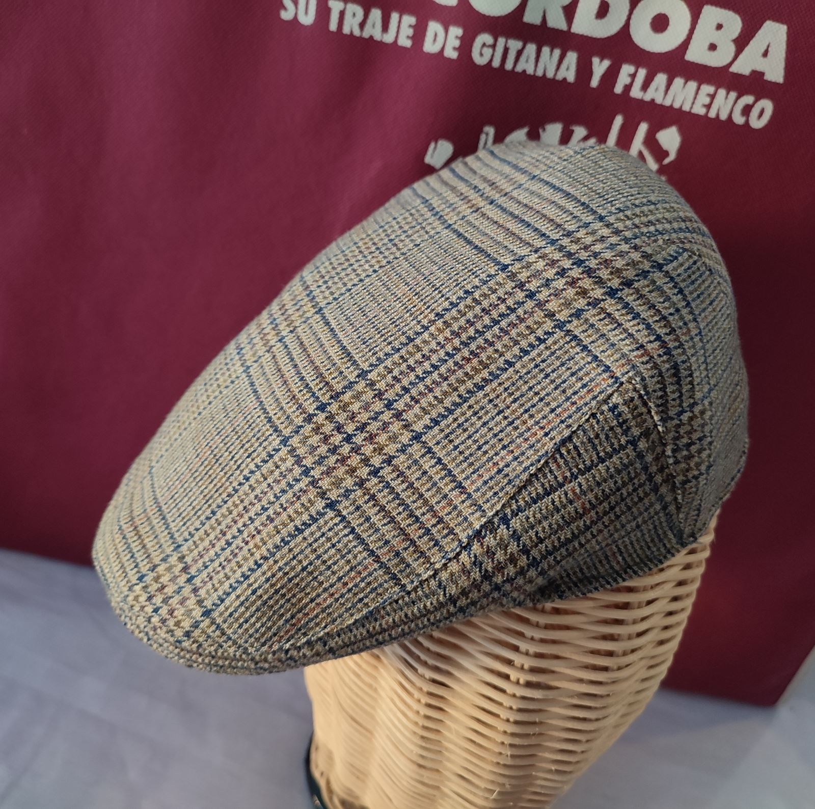 Gorra campera de invierno confeccionada en cuadros gales en tonos azules, granates y verdes.