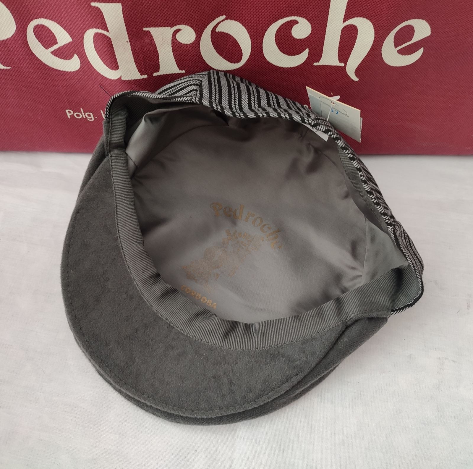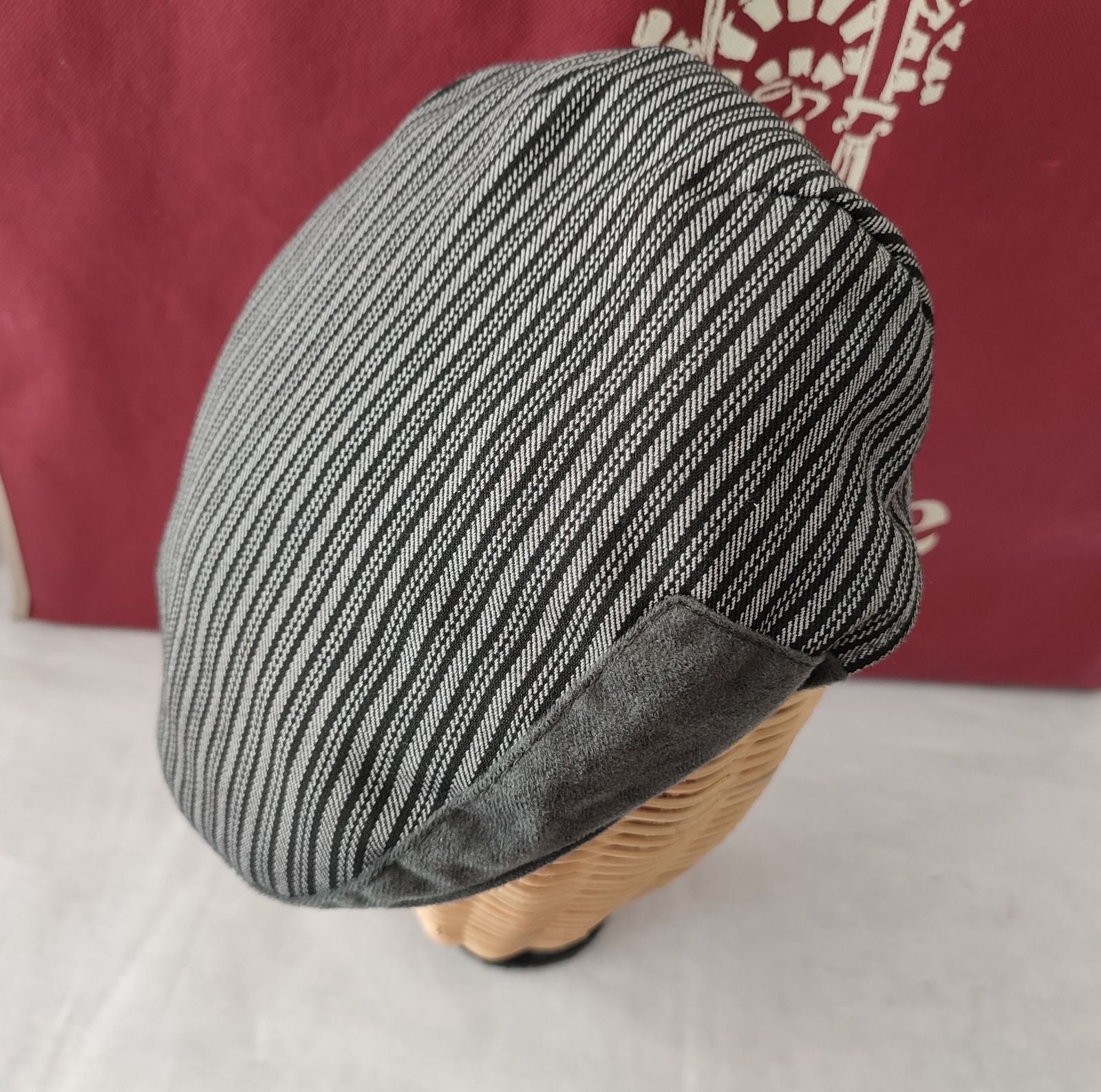 Gorra campera confeccionada en raya campera gris con vicera en antelina gris.
