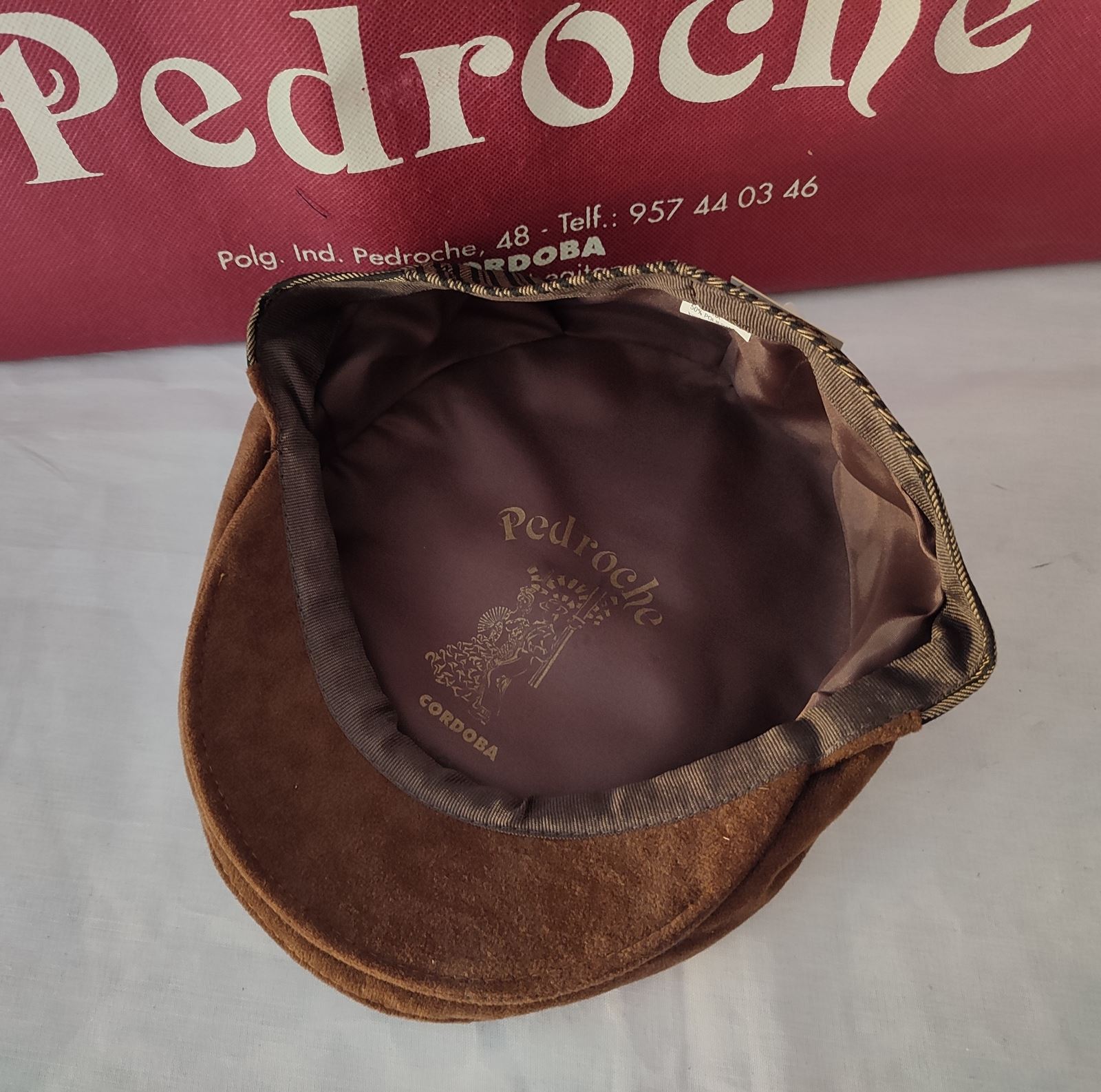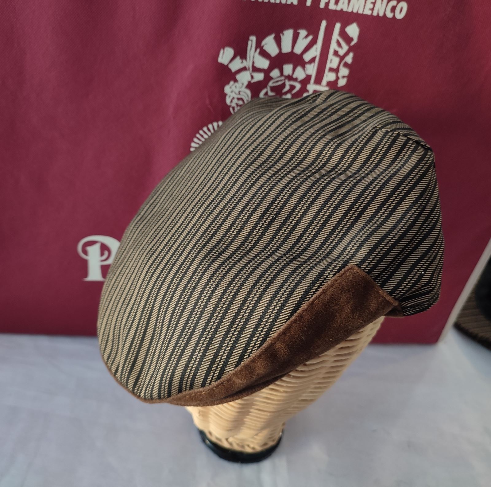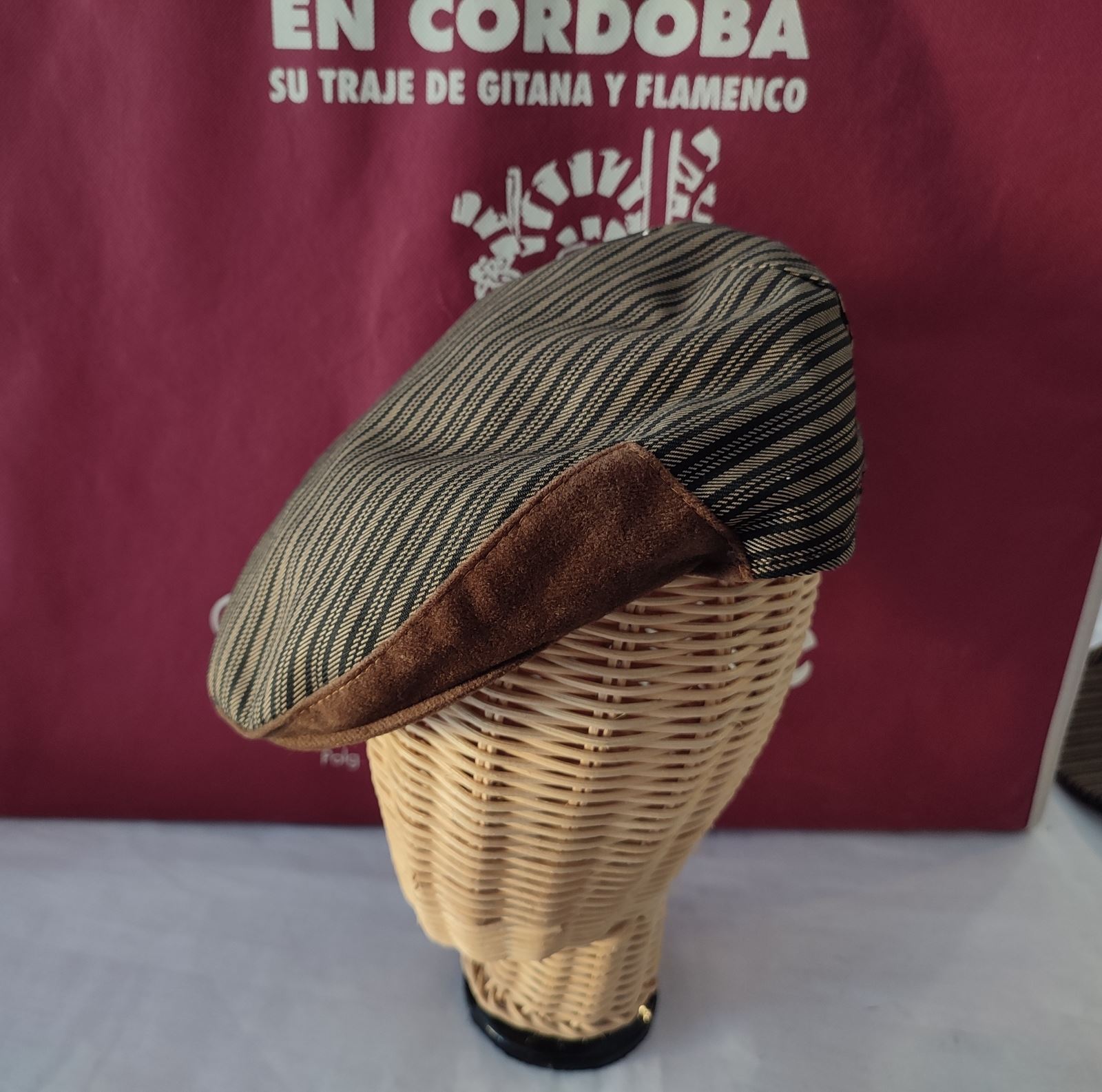 Gorra campera confeccionada en raya campera marron con vicera en antelina marron.