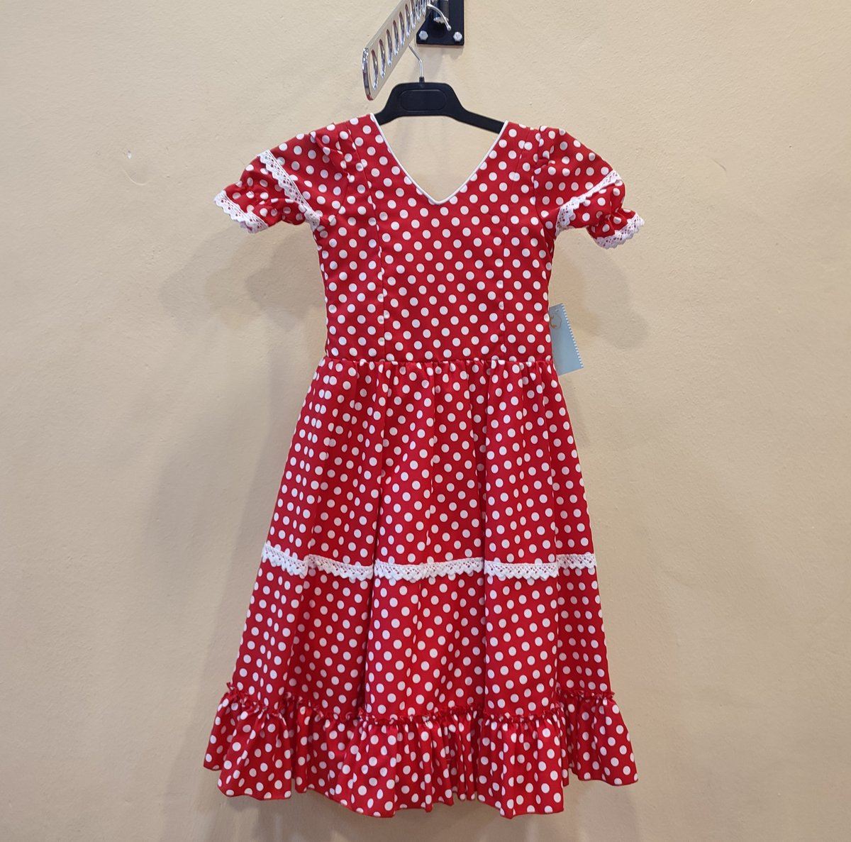 Vestido largo para niña confeccionado en popelin rojo con lunar blanco.