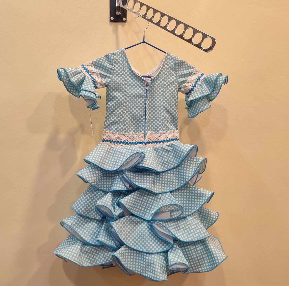 Vestido largo confeccionado en tela de popelin turquesa con lunar blanco.