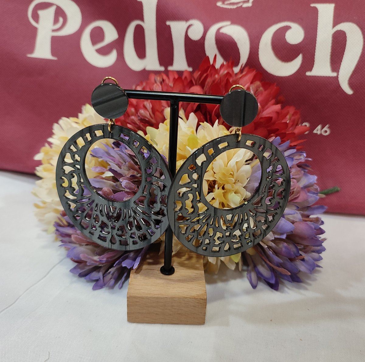 Pendiente de aro calado en acetato negro nacarado.