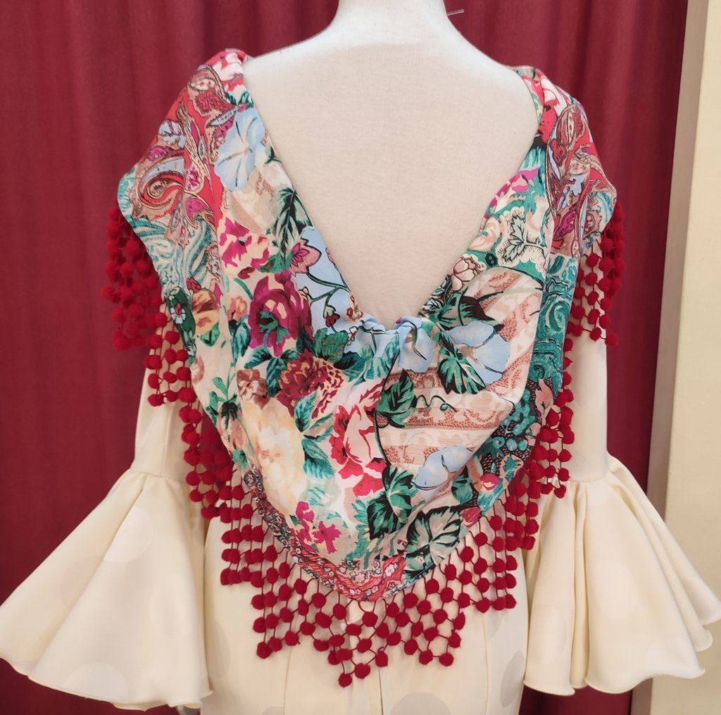 Manton en tela de crespon estampado de patchwork sobre fondo celeste.