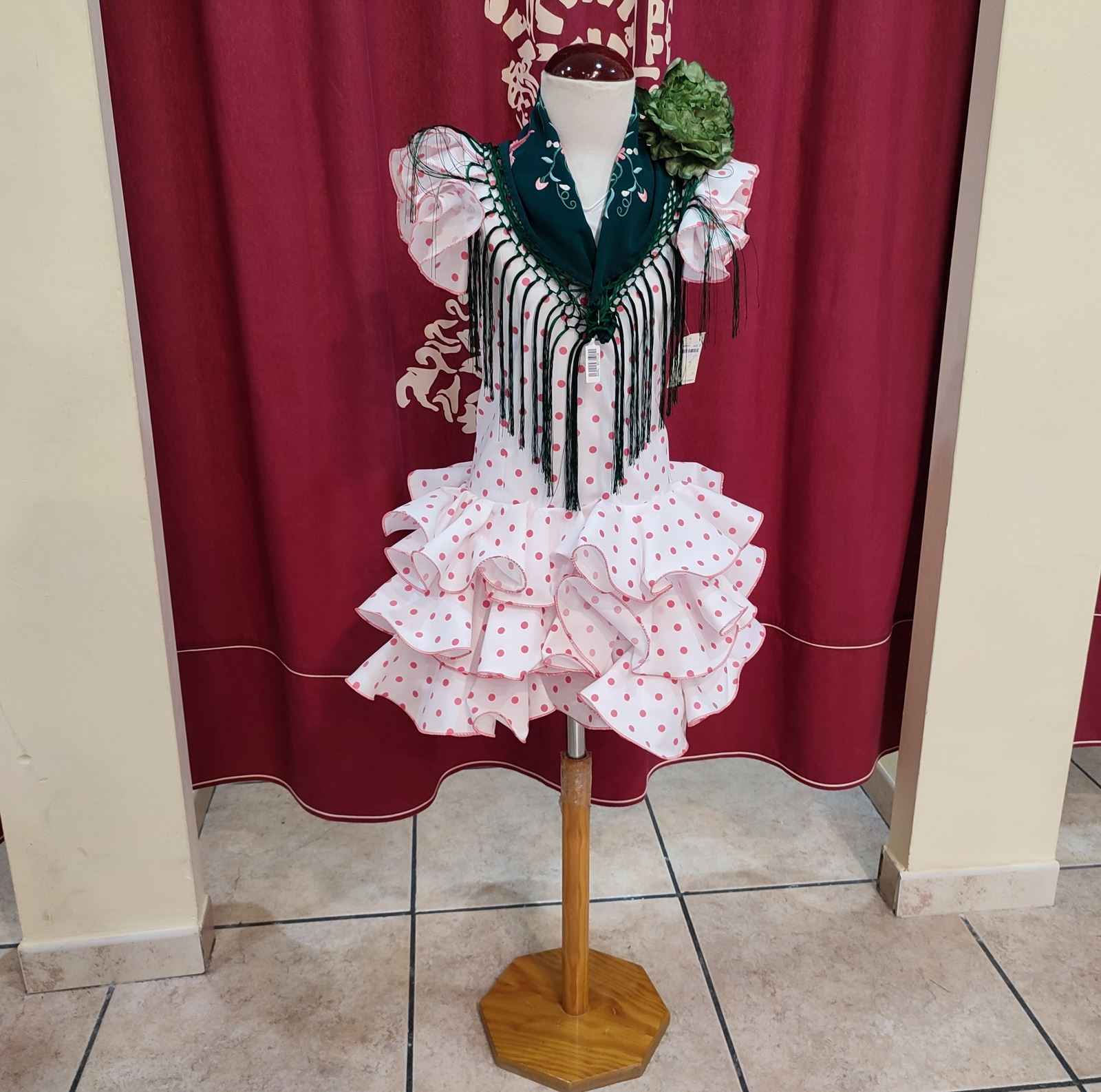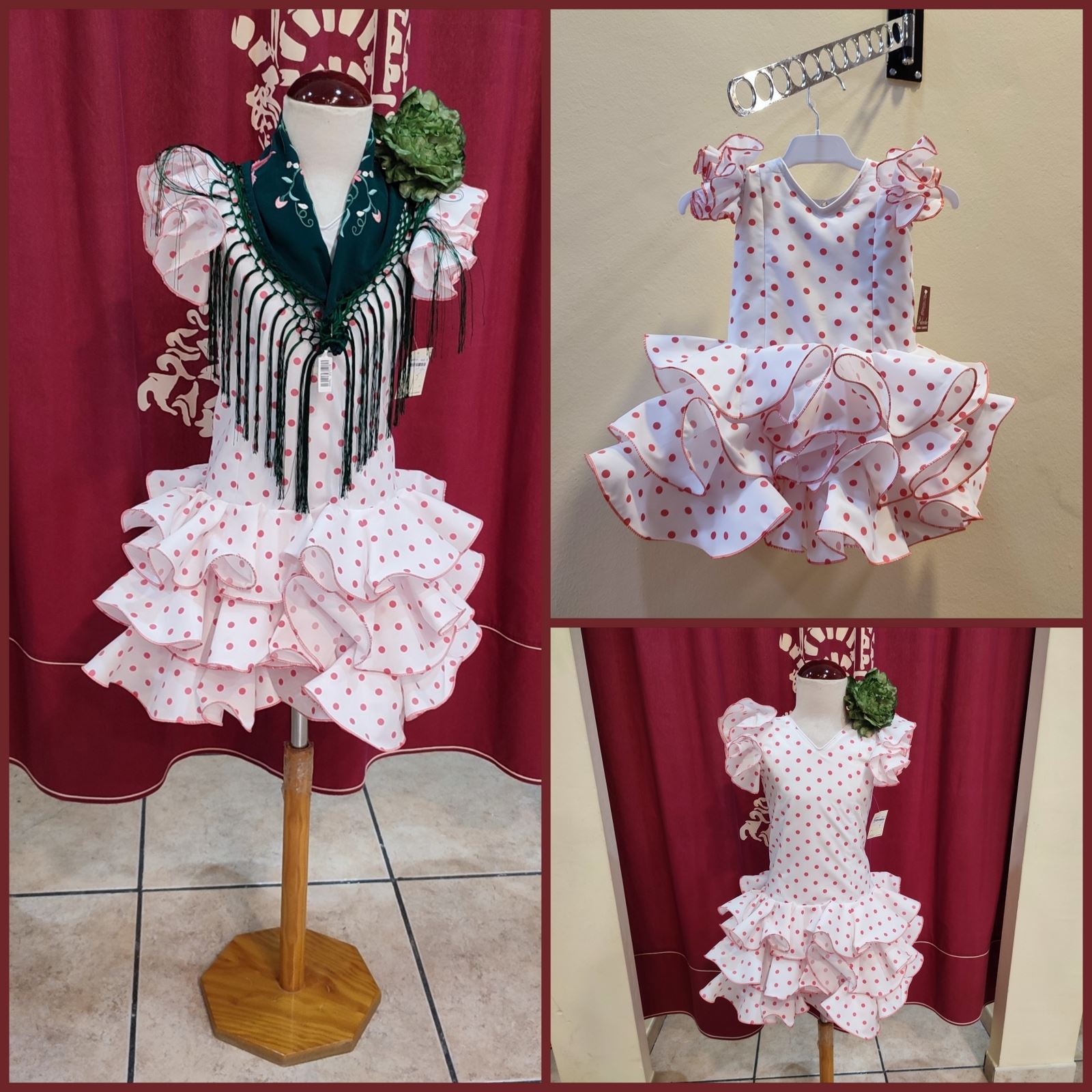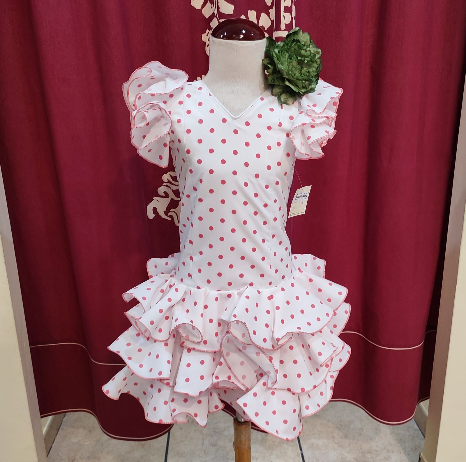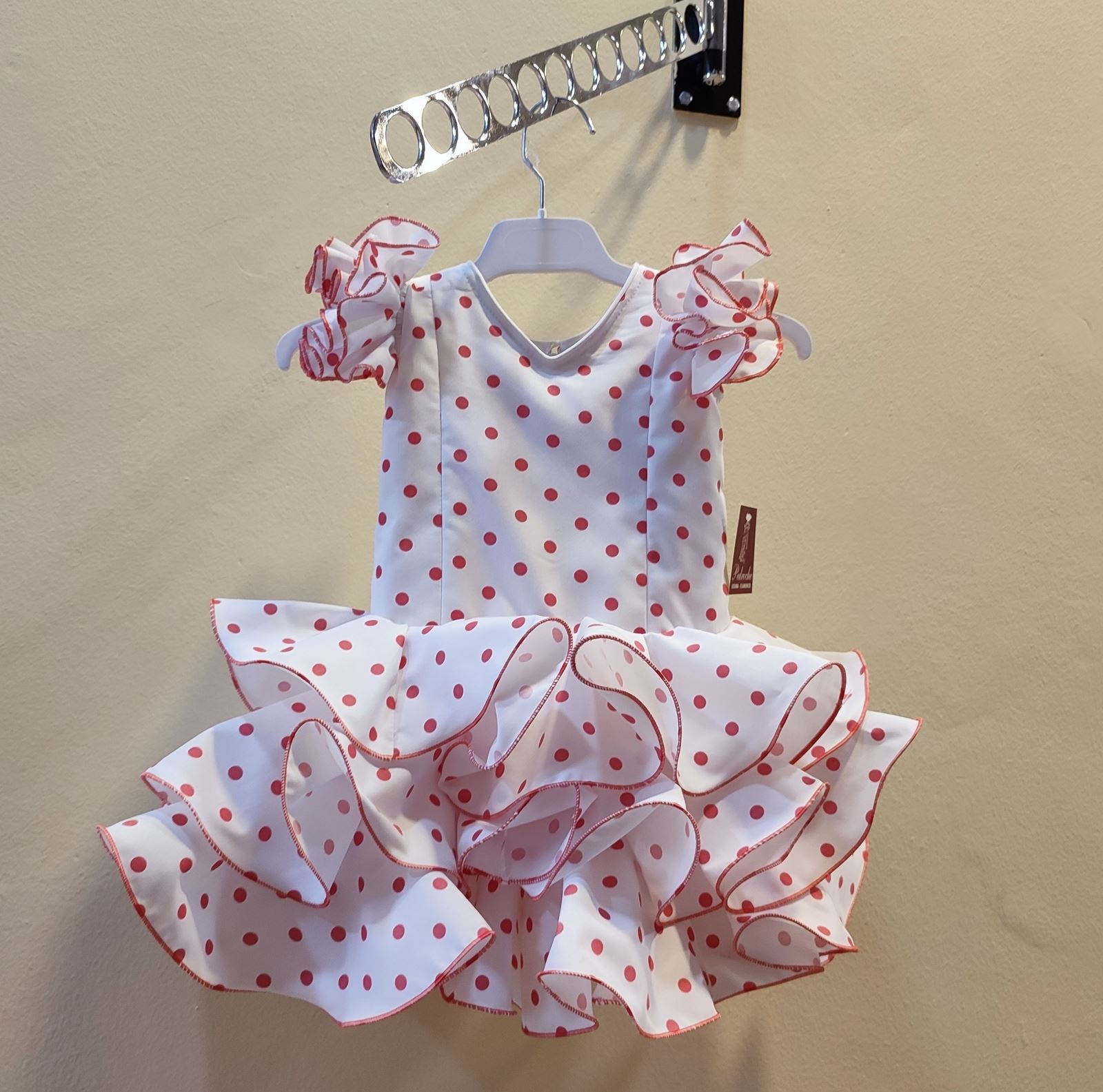 Vestido corto confeccionado en tela de popelin blanco con lunar coral .