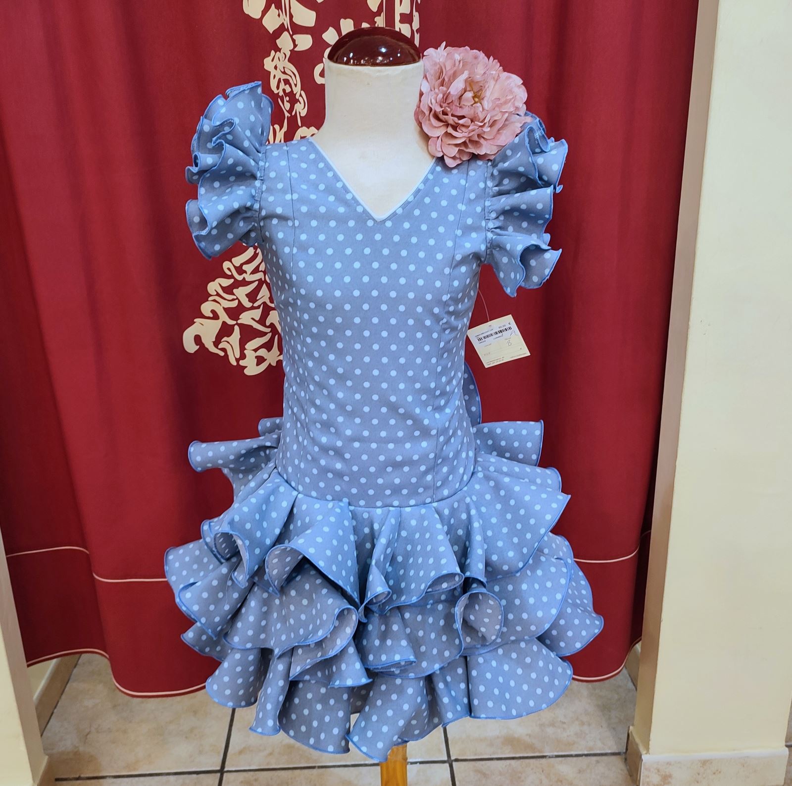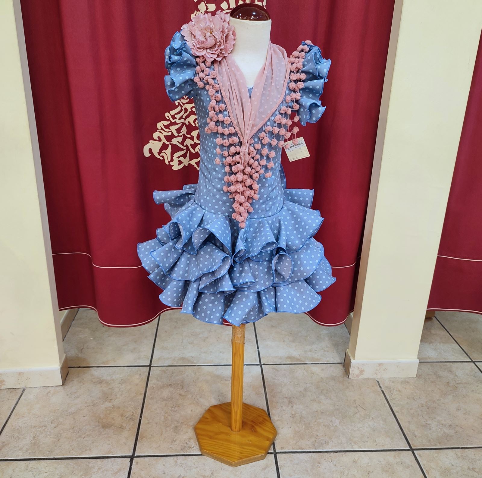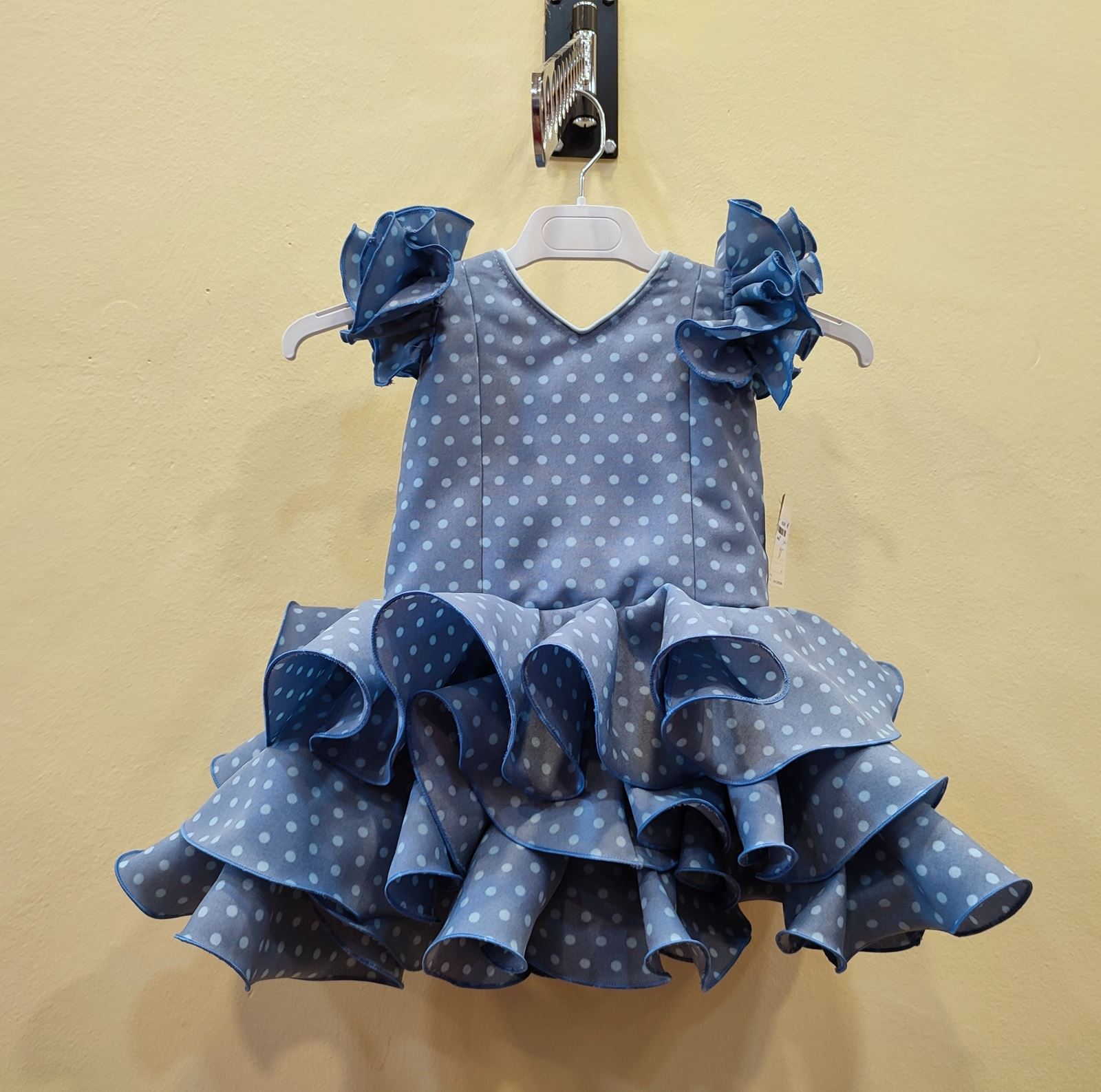 Vestido corto confeccionado en tela de strech en color ducados con lunar celeste.