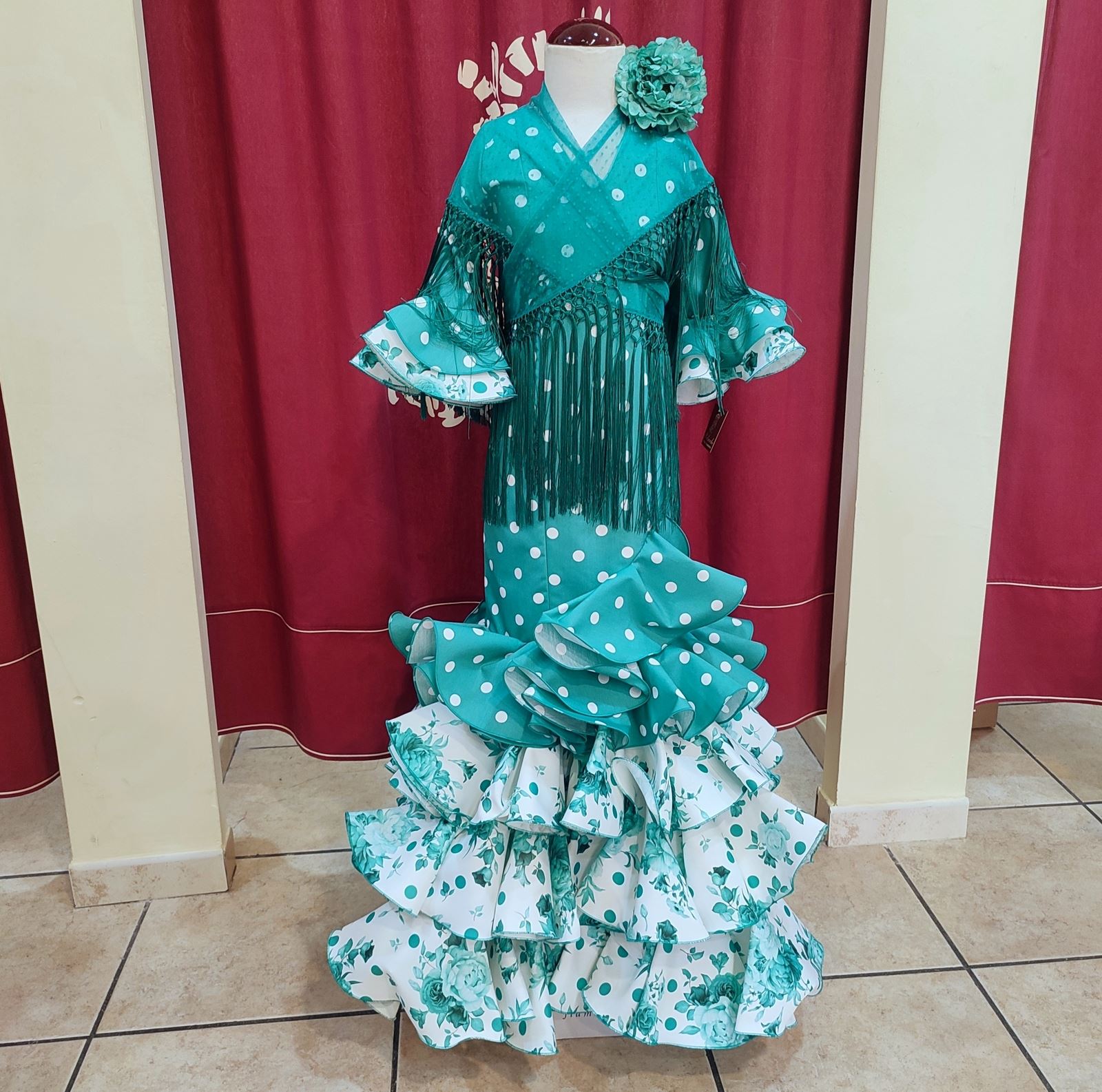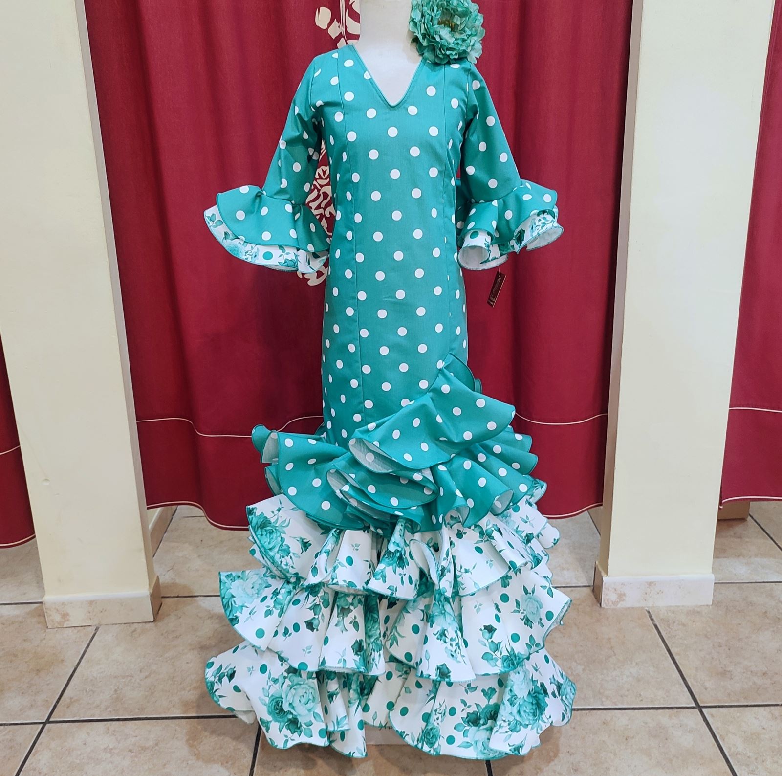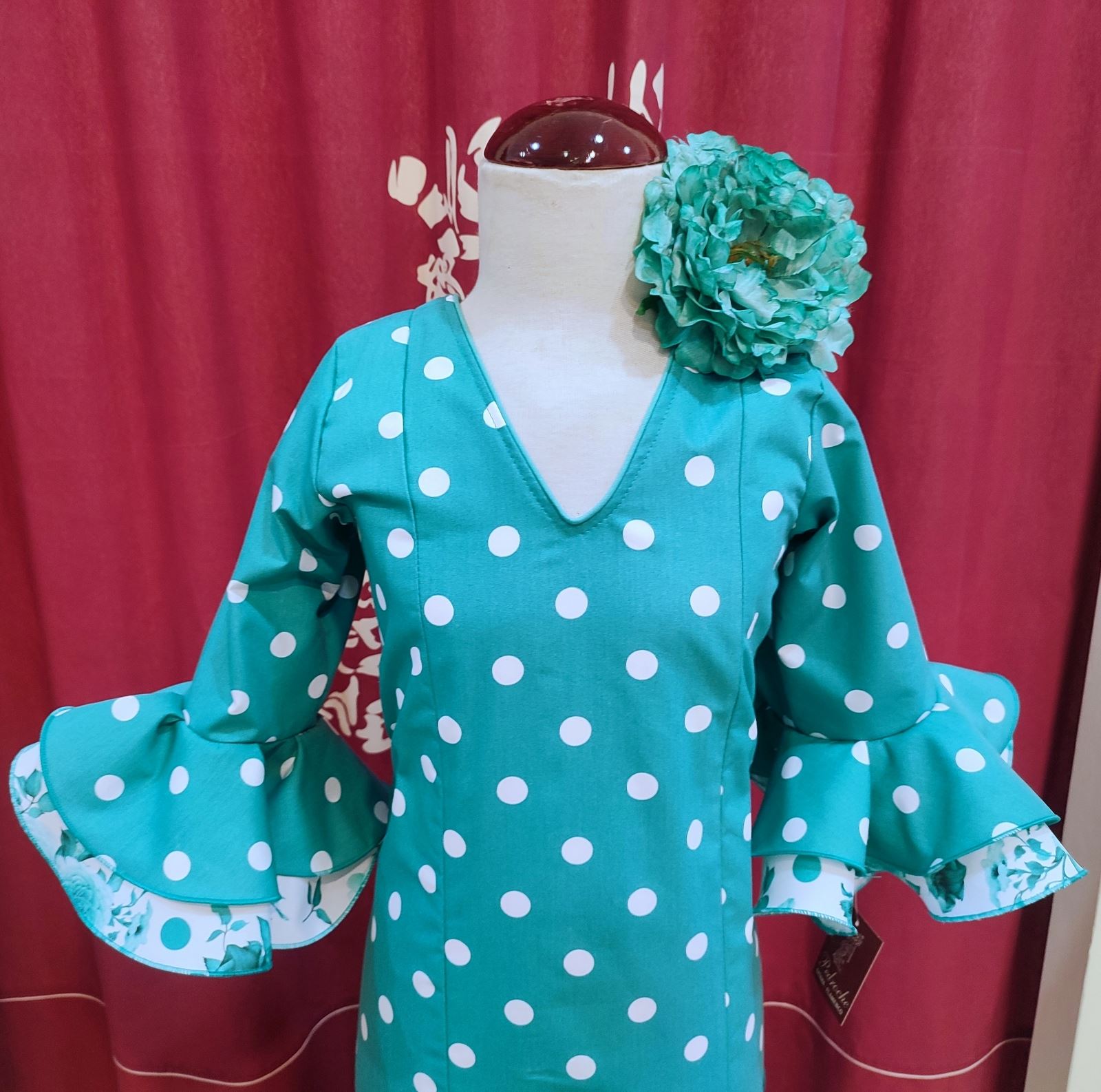 Vestido largo confeccionado en tela de popelin aguamarina con lunar grande blanco.