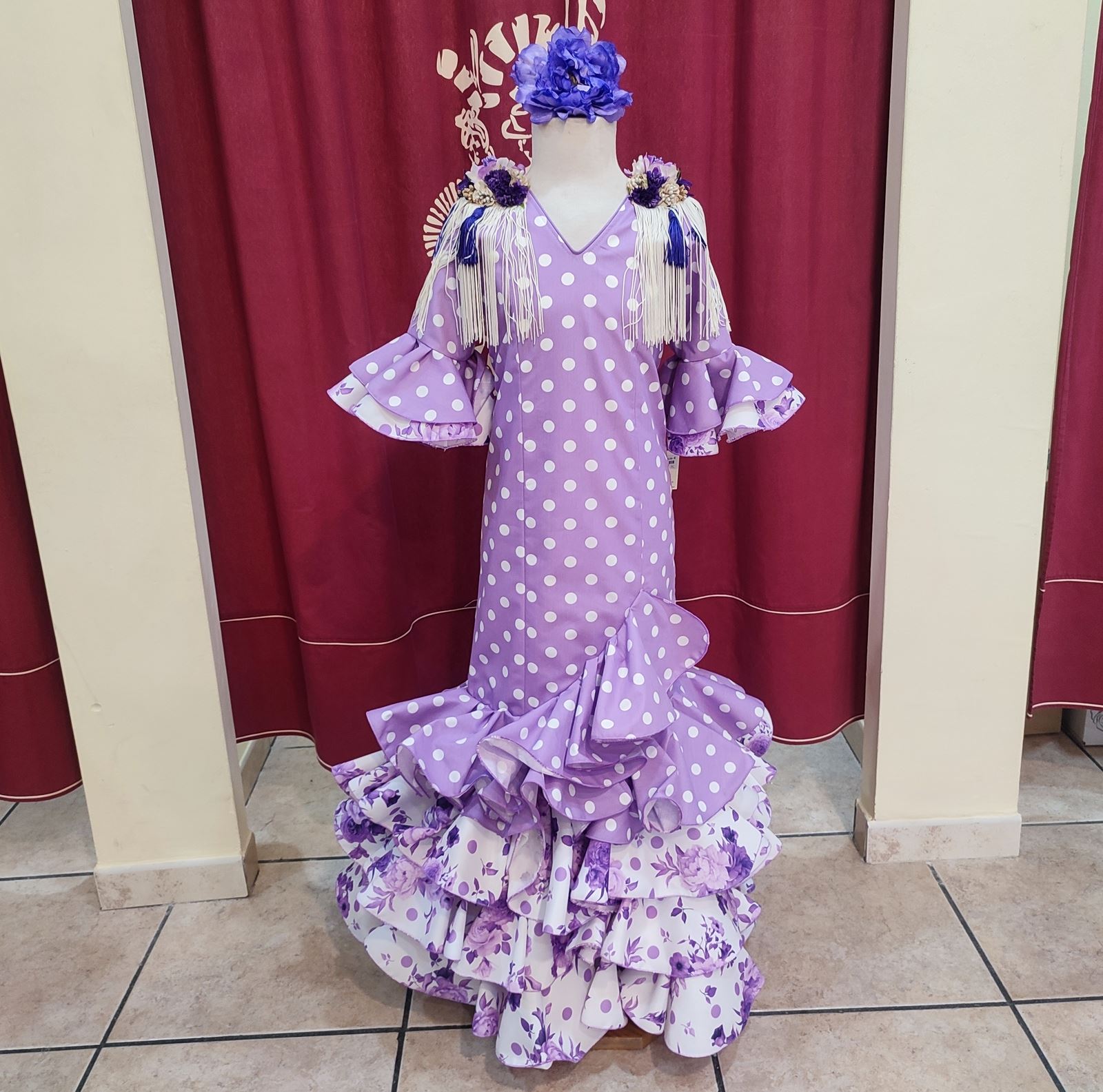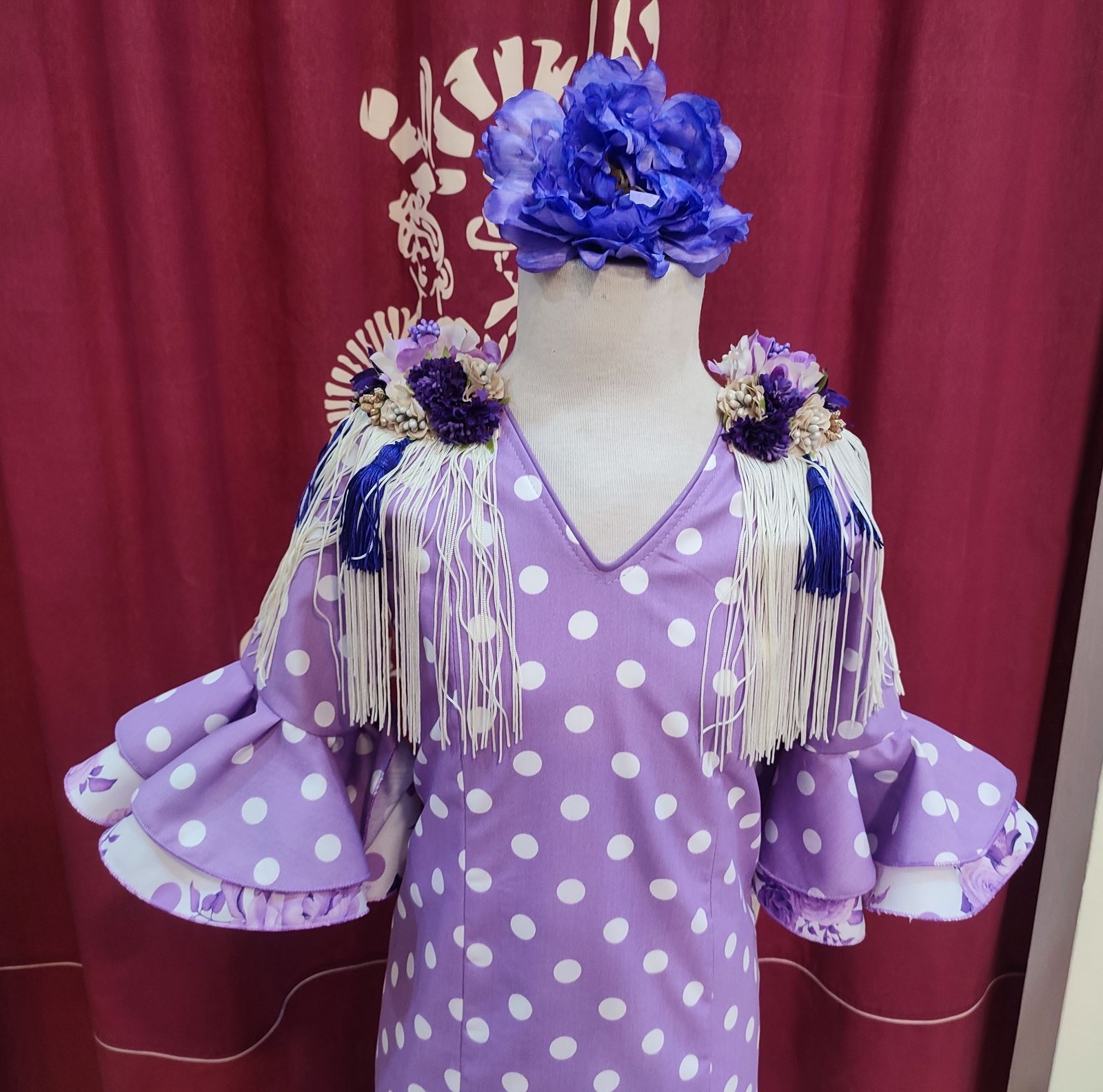 Vestido confeccionado en tela de popelin malva con lunar blanco.