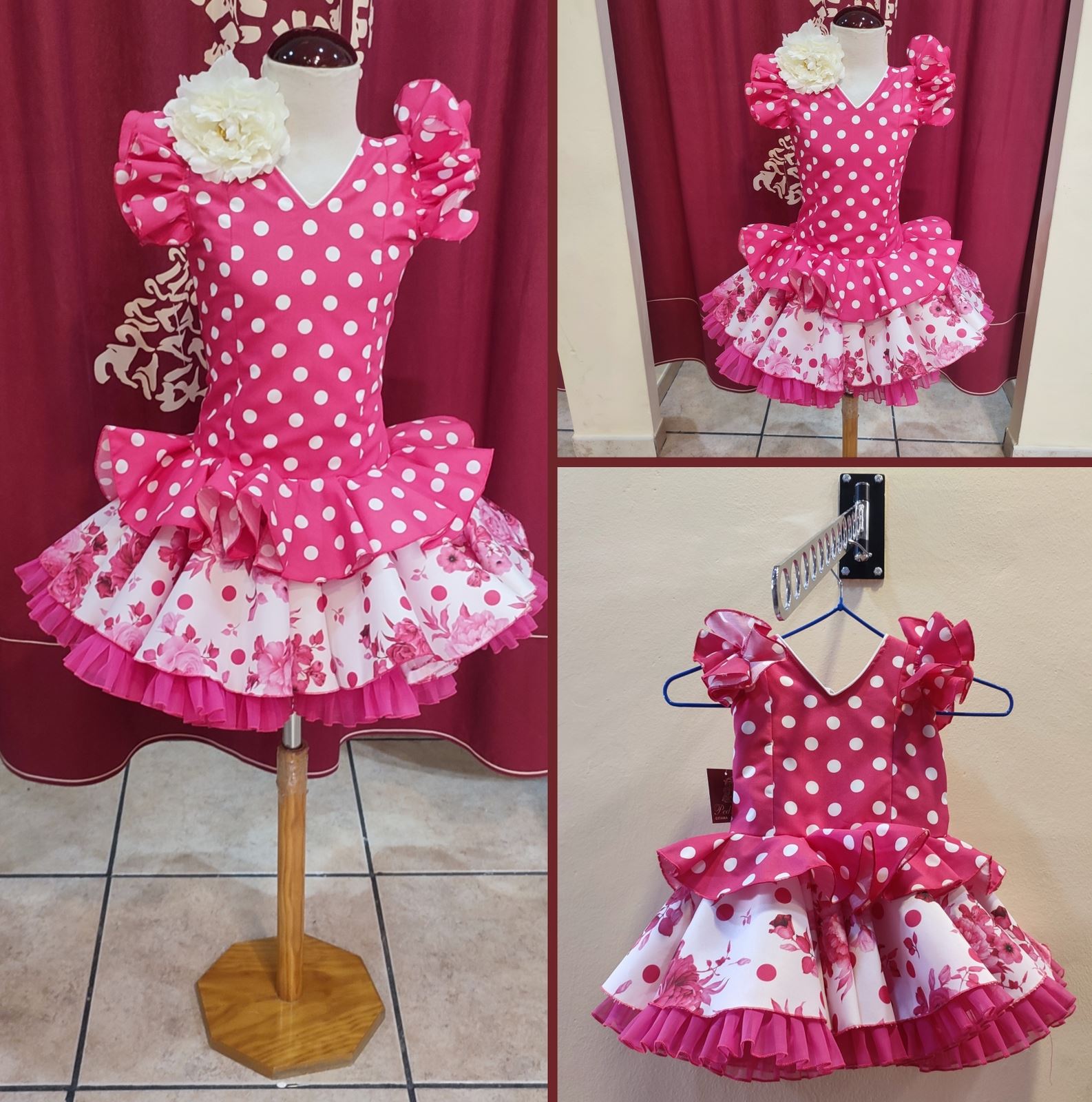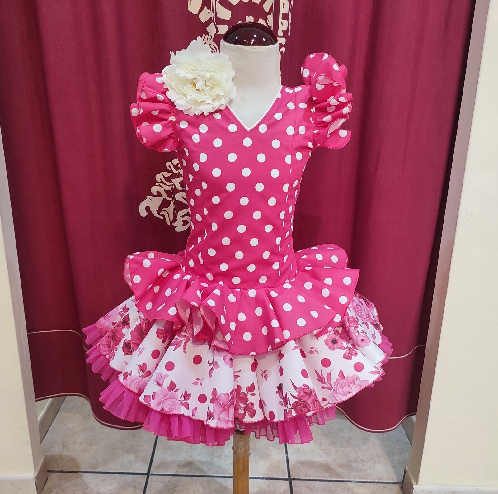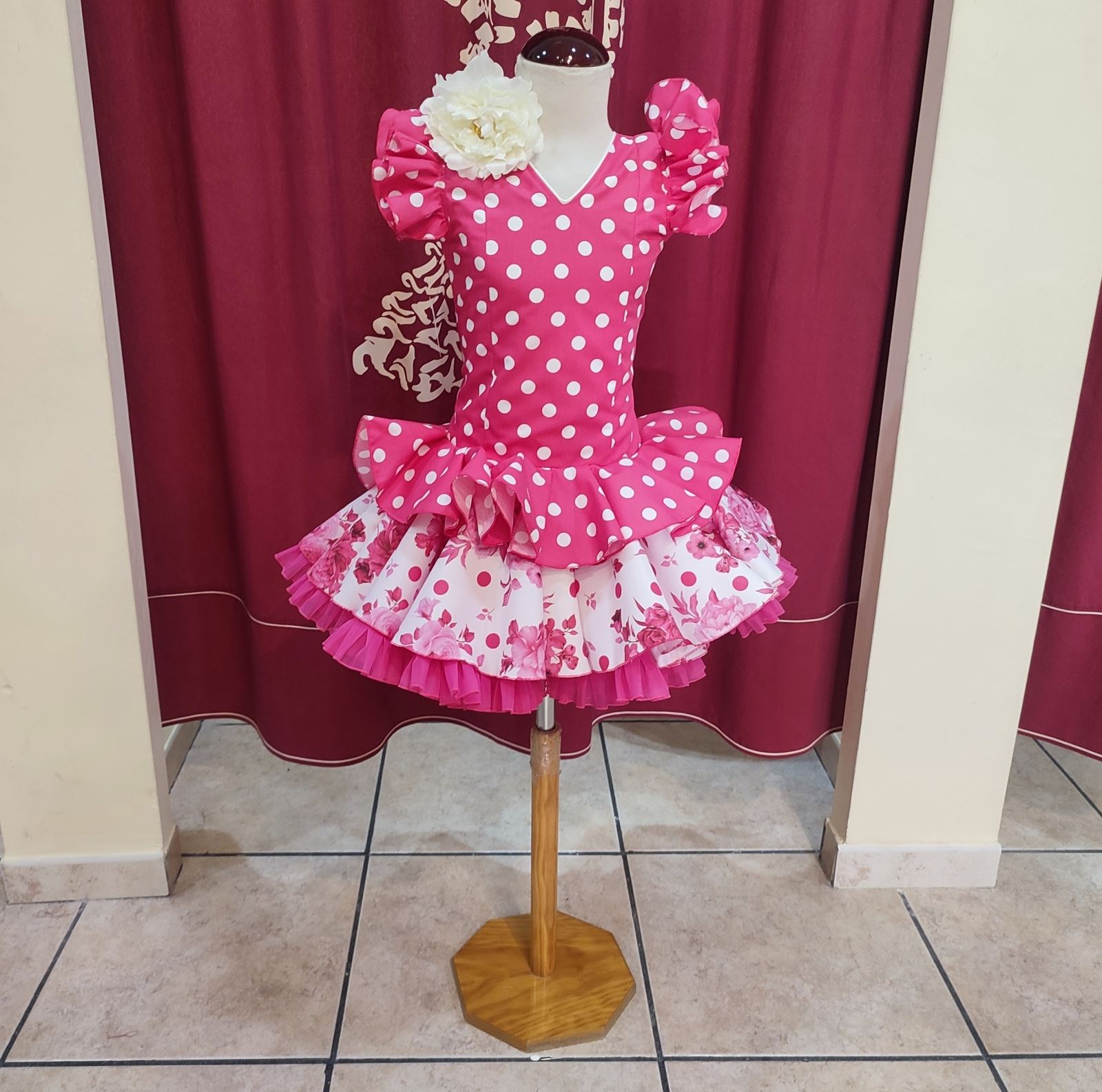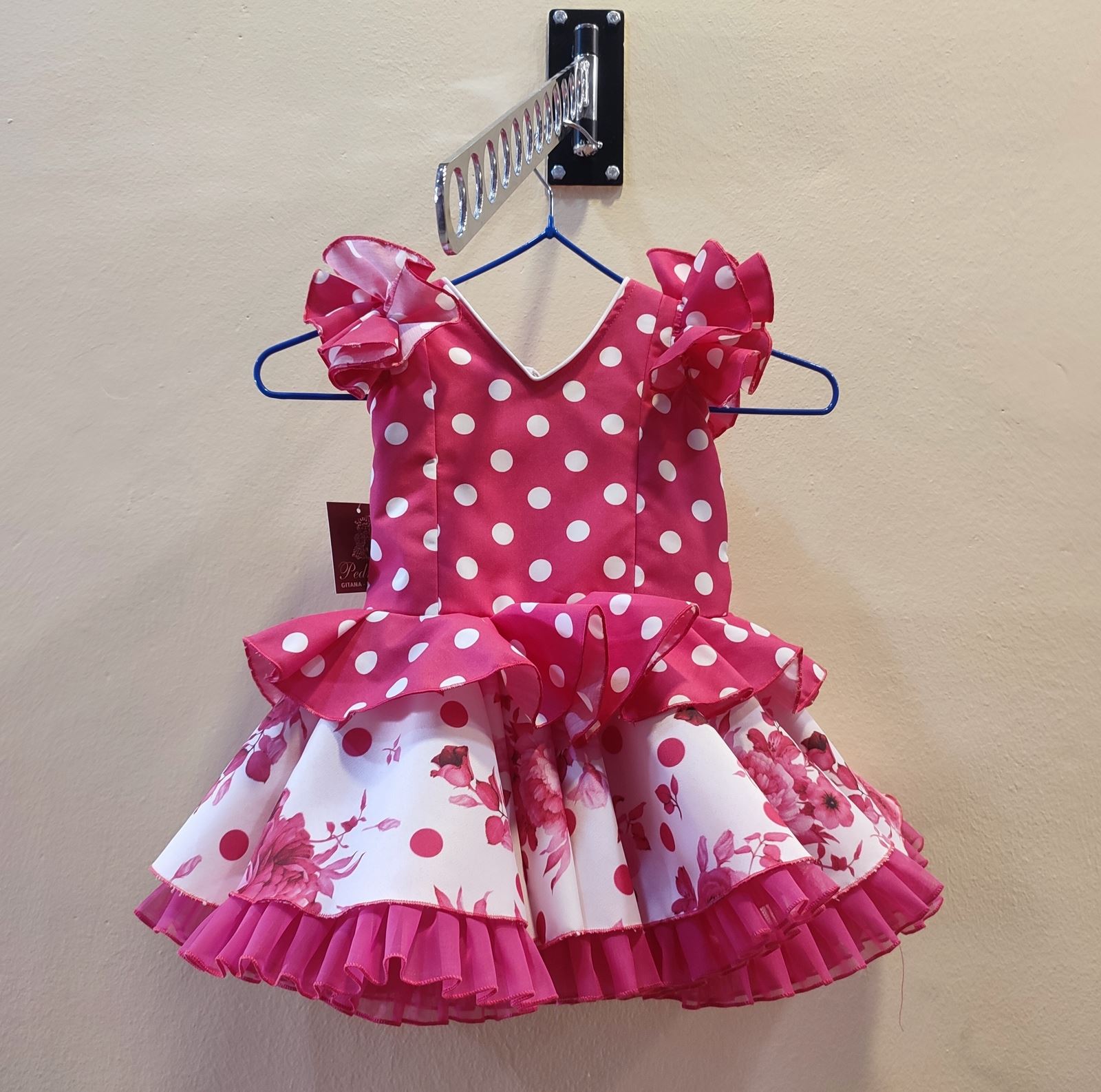 Vestido corto confeccionado en popelin fucsia con lunar blanco.