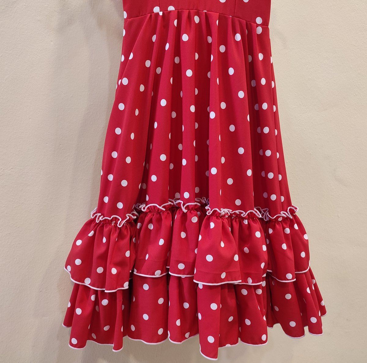Vestido canastero desde cintura, confeccionado en rojo con lunar blanco.
