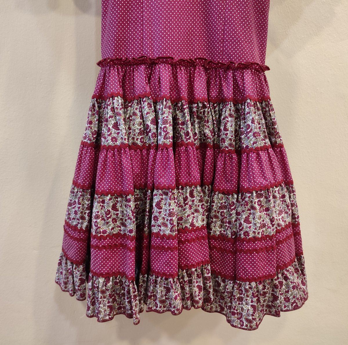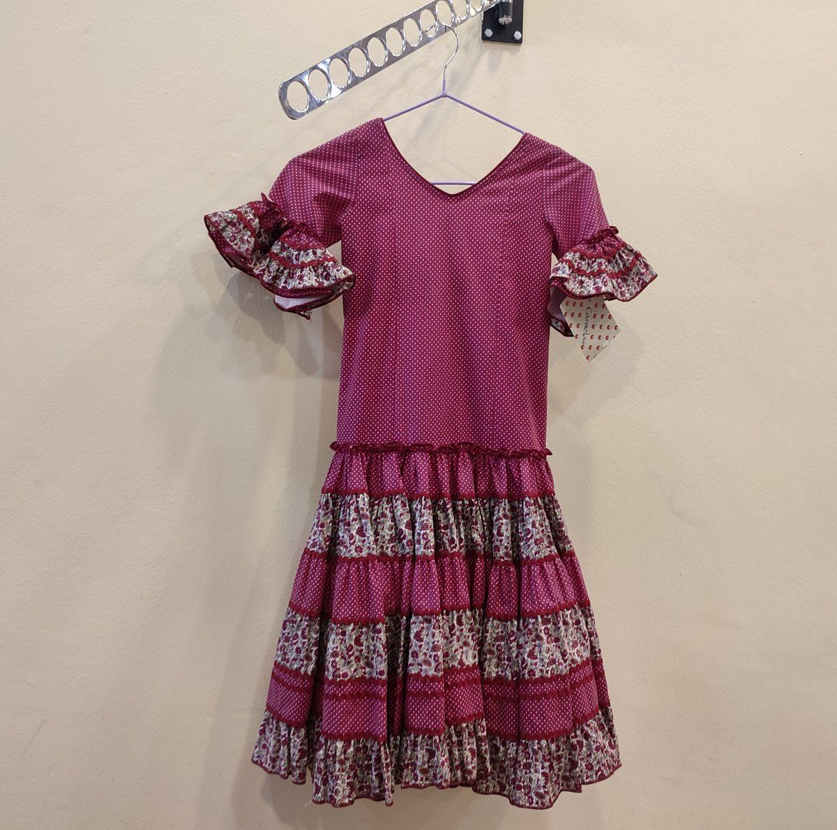 Vestido largo confeccionado en popelin granate con lunarito y cortes en estampado.