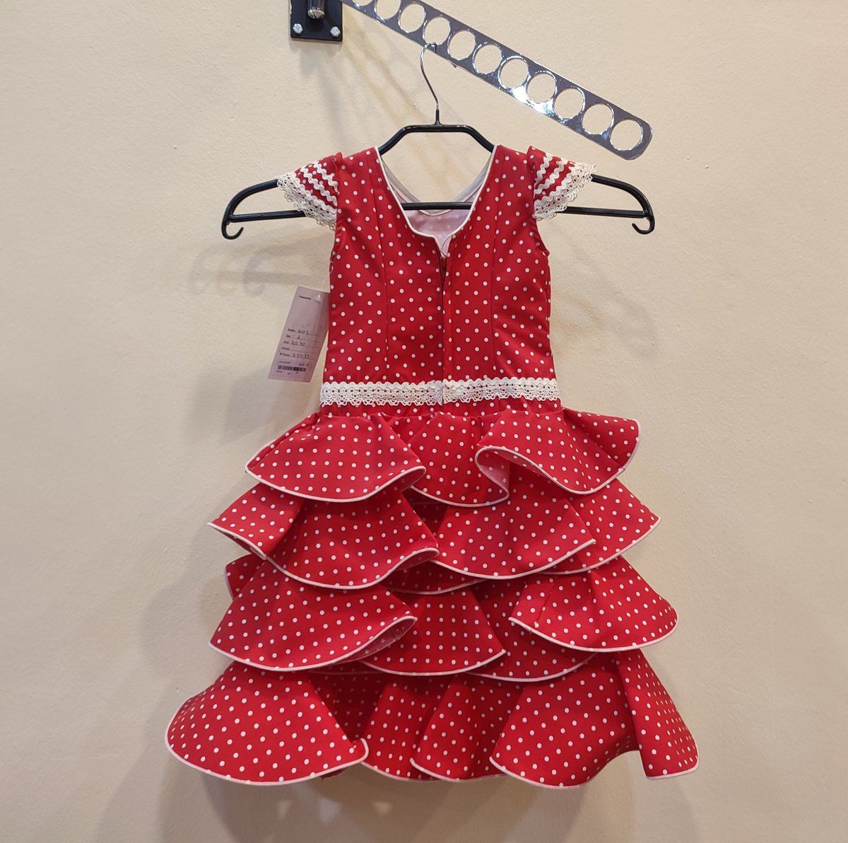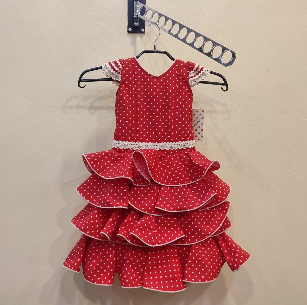 Vestido largo confeccionado en rojo con lunar blanco y adorno de bolillo.
