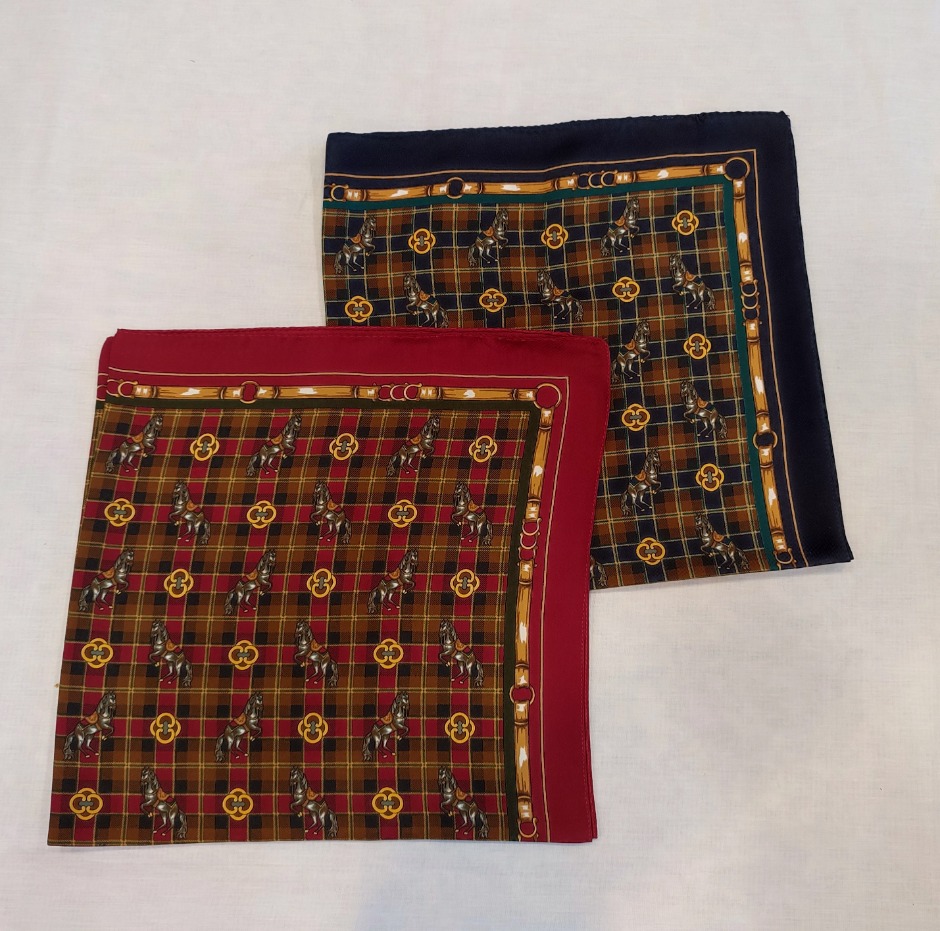 Pañuelo en color con cuadros y caballos en tonos dorados y camel.