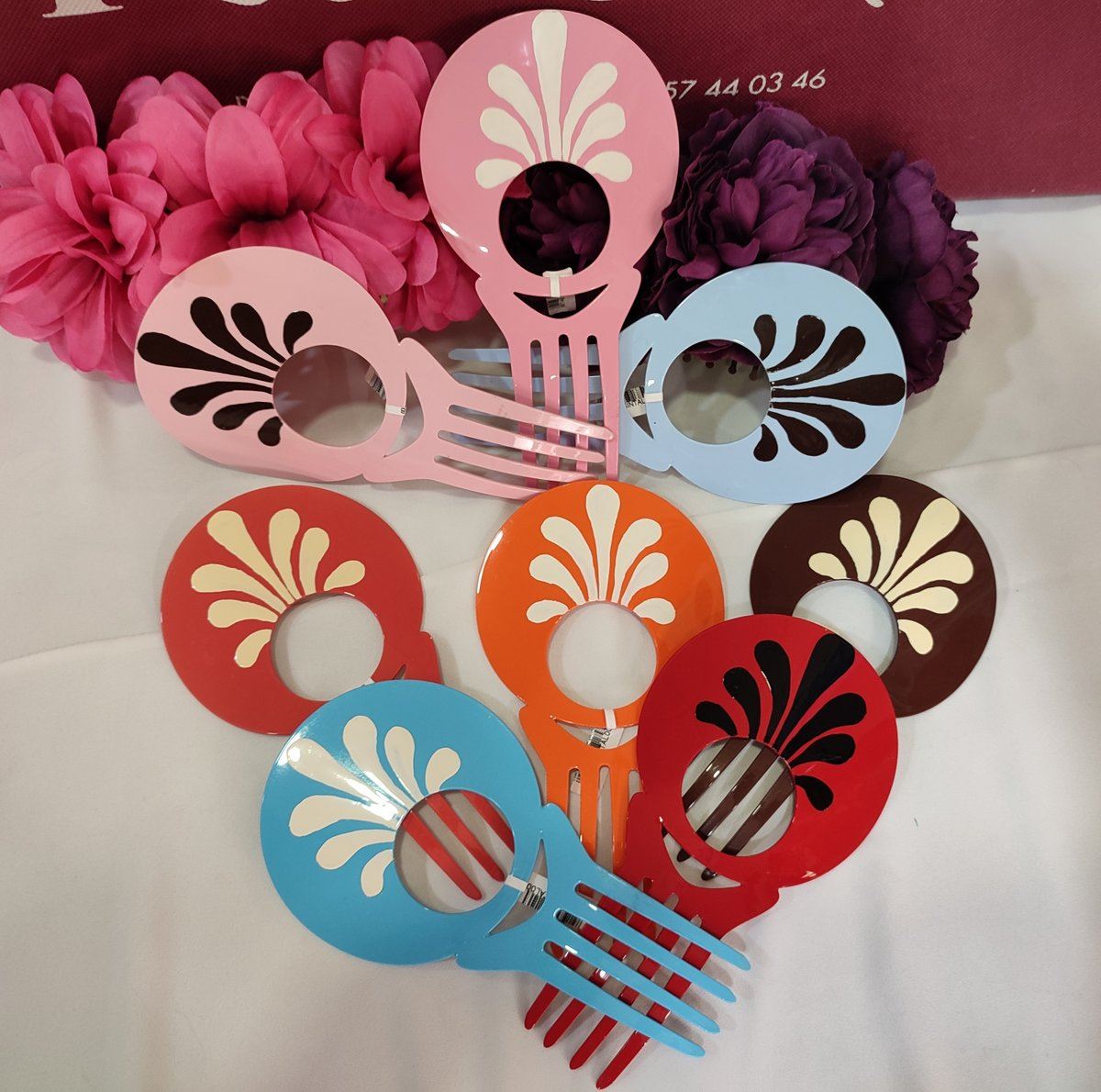 Peina en acetato con adornos de gotas pintadas.