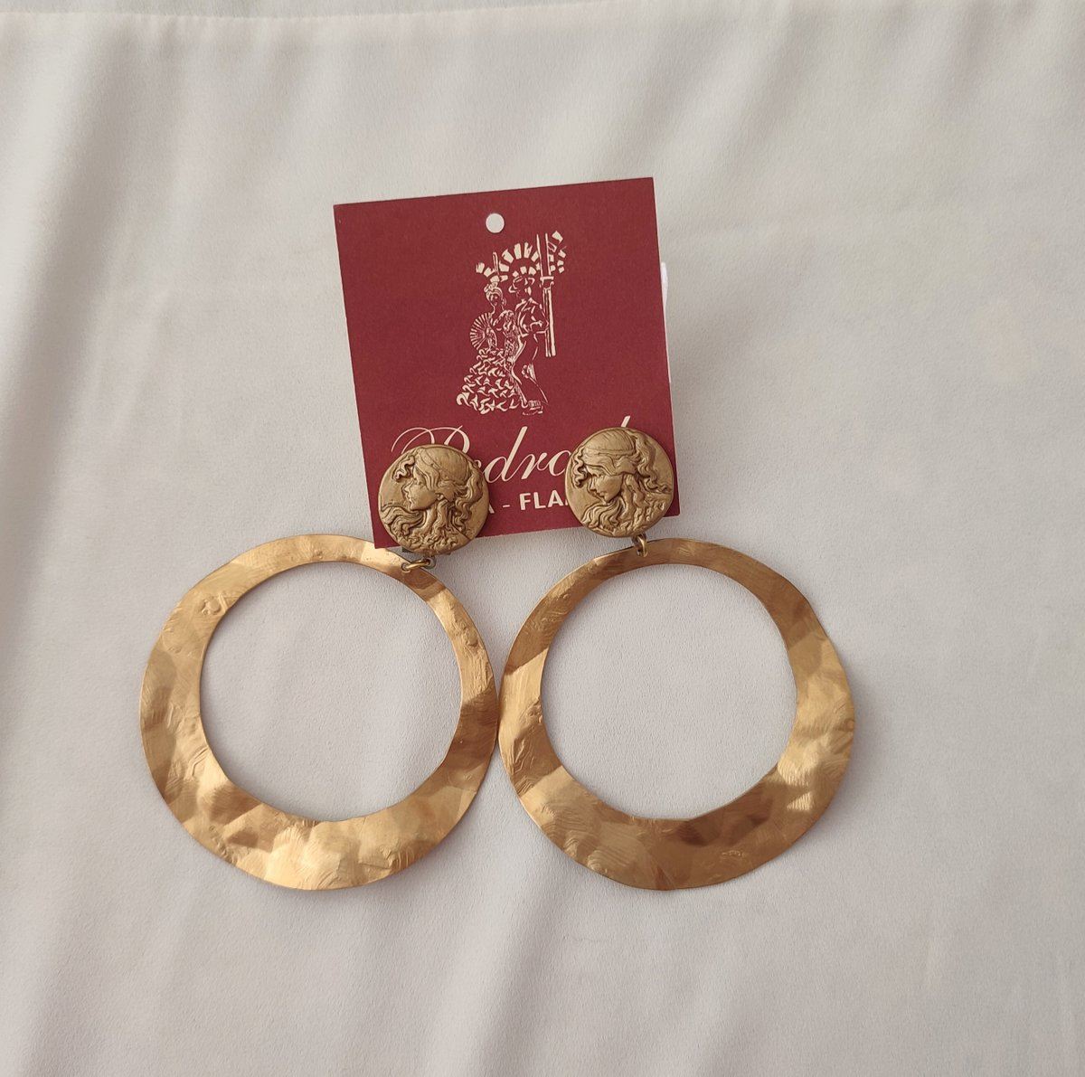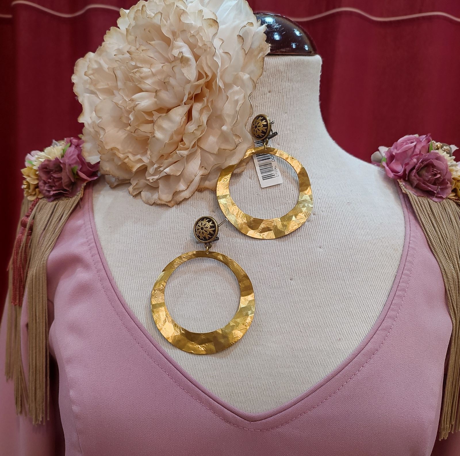 Pendiente de flamenca para señora. Pendiente en forma de aro. Color dorado machacado. Argolla en dorado viejo. Cierre omega
