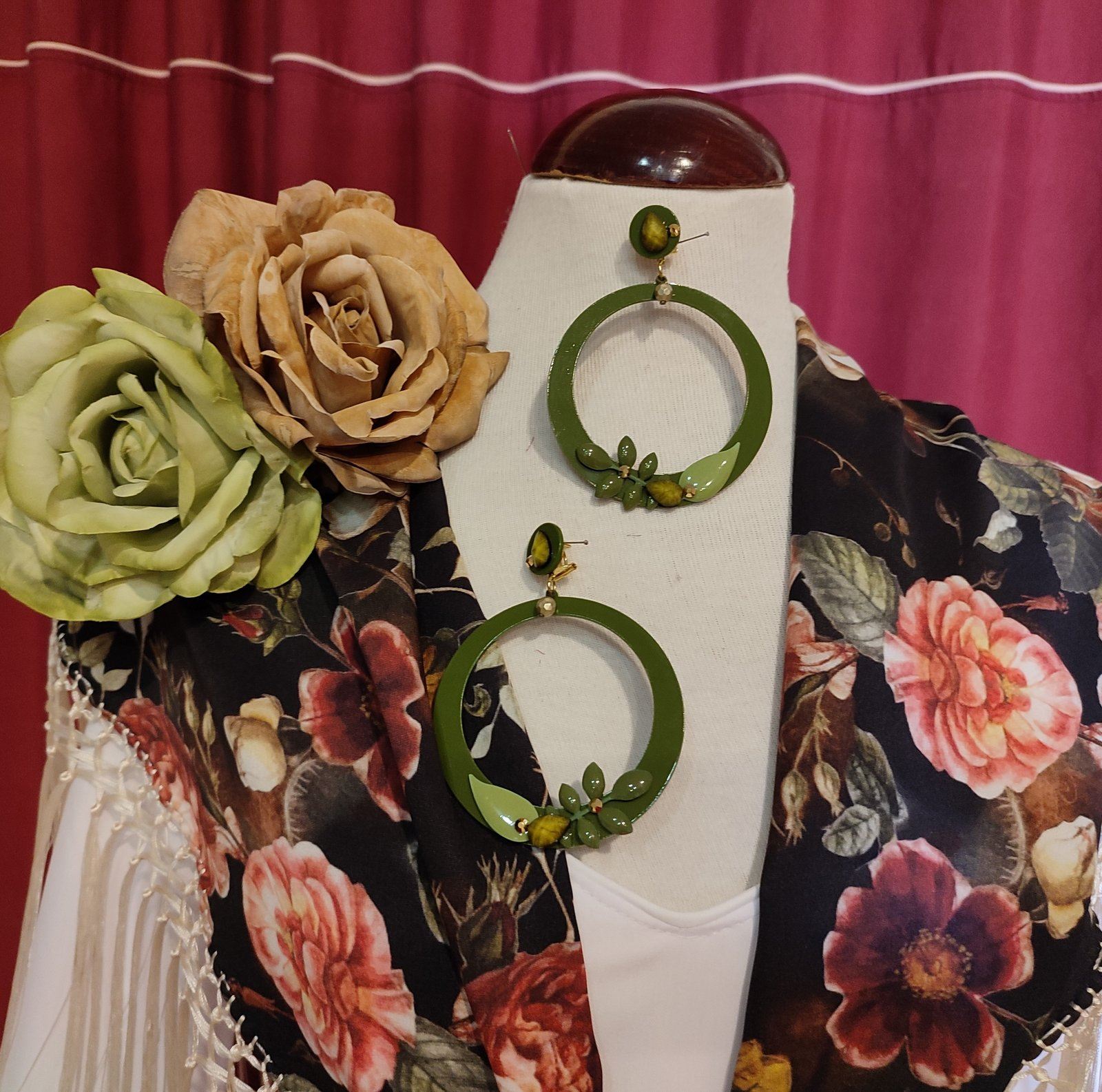 Pendiente de flamenca. Tamaño señora. Fabricado en material de acetato esmaltado. Adornos de hojas con brillo. Cierre omega.