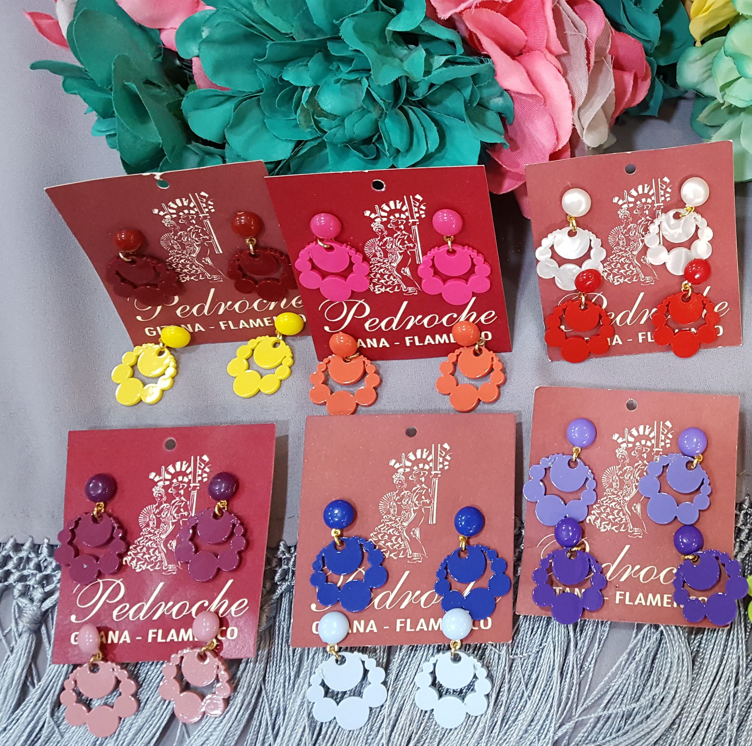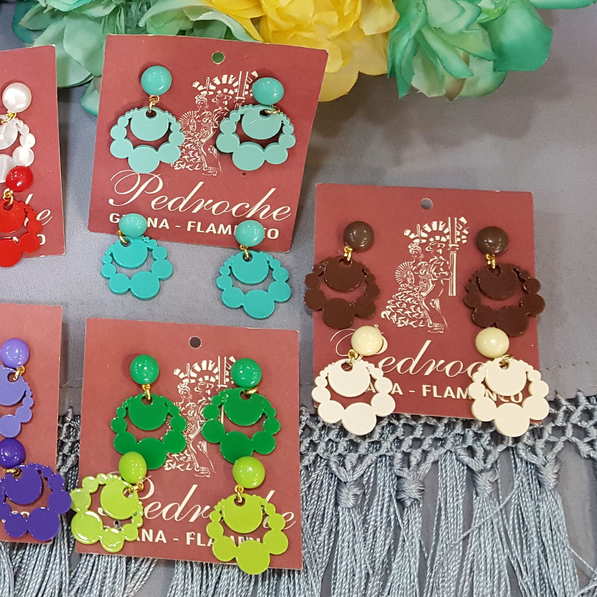 Pendiente de flamenca.Tamaño para bebe. Fabricado en material de acetato. Forma de aro con circulos. Cierre de tuerca.