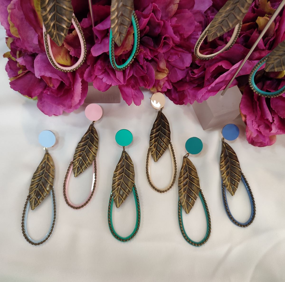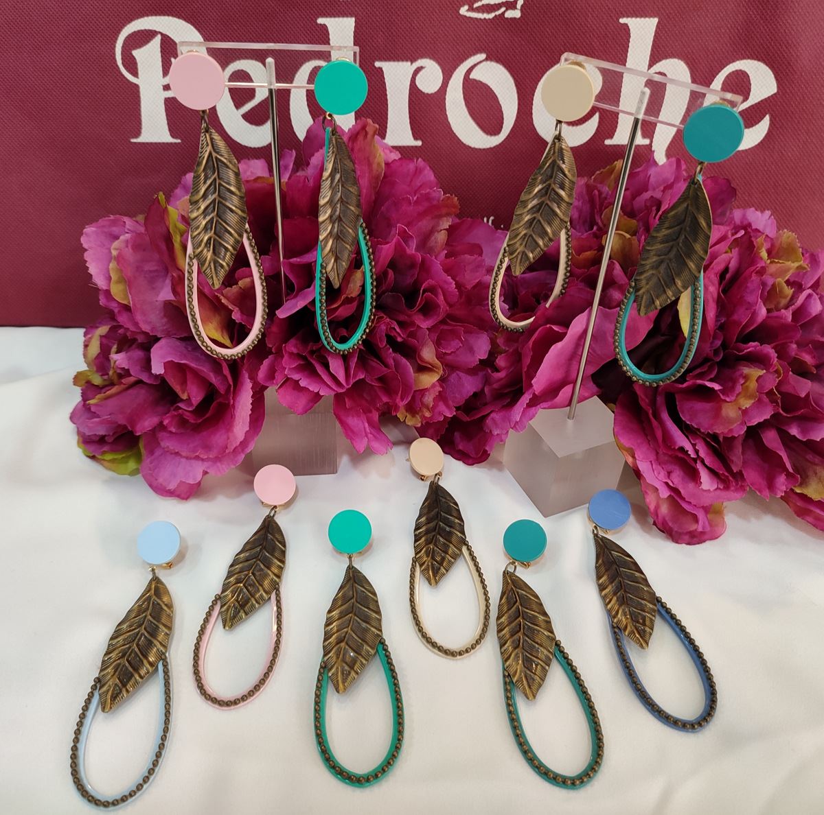 Pendiente de flamenca. Tamaño señora. Fabricado en material de acetato. Forma de lagrima con adorno de hojas en metal dorado viejo. Cierre omega.