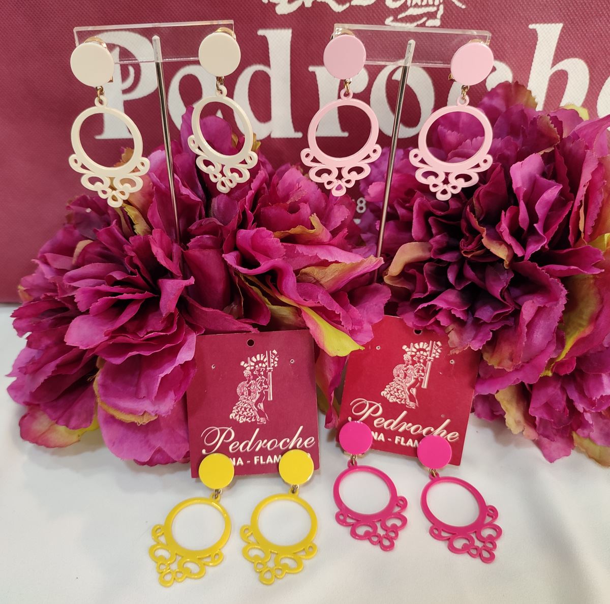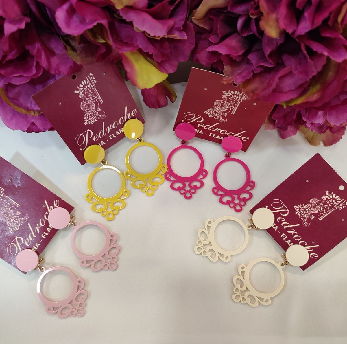 Pendiente de flamenca para niña. Pendiente fabricado en material de acetato. Forma de aro calado con acabado de filigrana. Cierre omega.