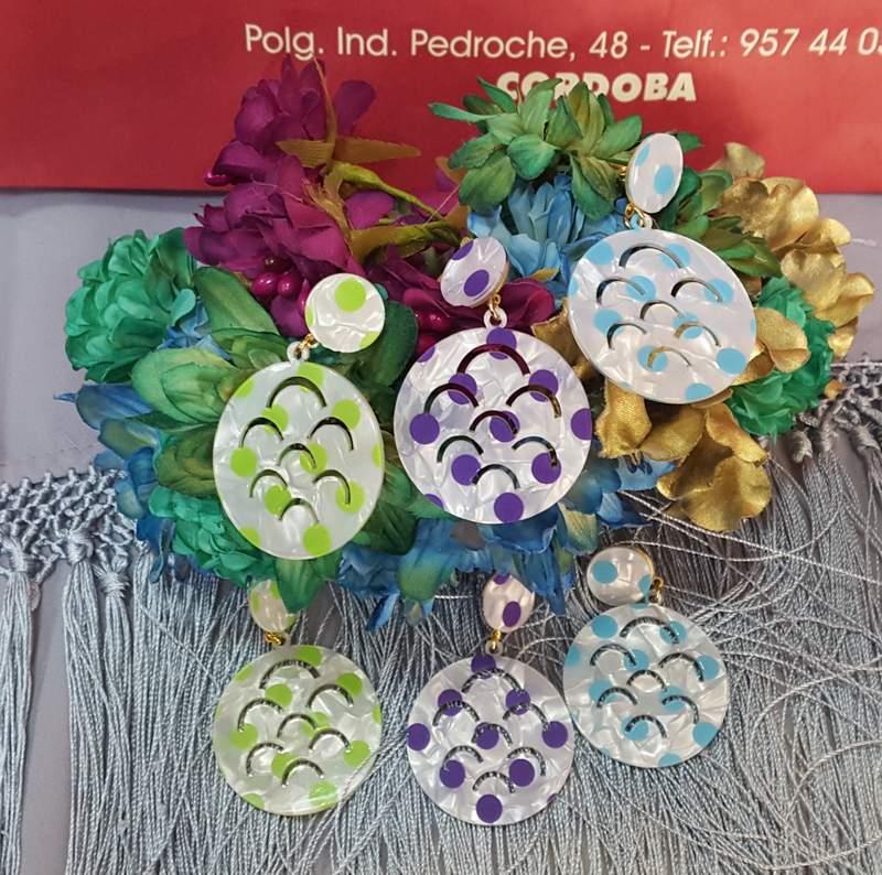Pendiente de flamenca para niña. Pendiente fabricado en material de acetato. Forma de aro calado en medias lunas. Color nacar con lunares. Cierre de tuerca.