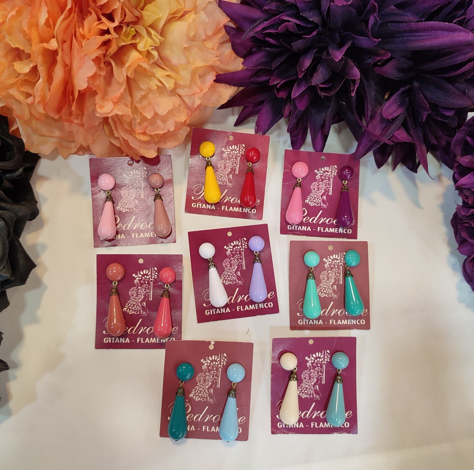 Pendiente de flamenca para niña. Pendiente en forma de lagrima. Fabricado en material de acetato. Cierre de tuerca.