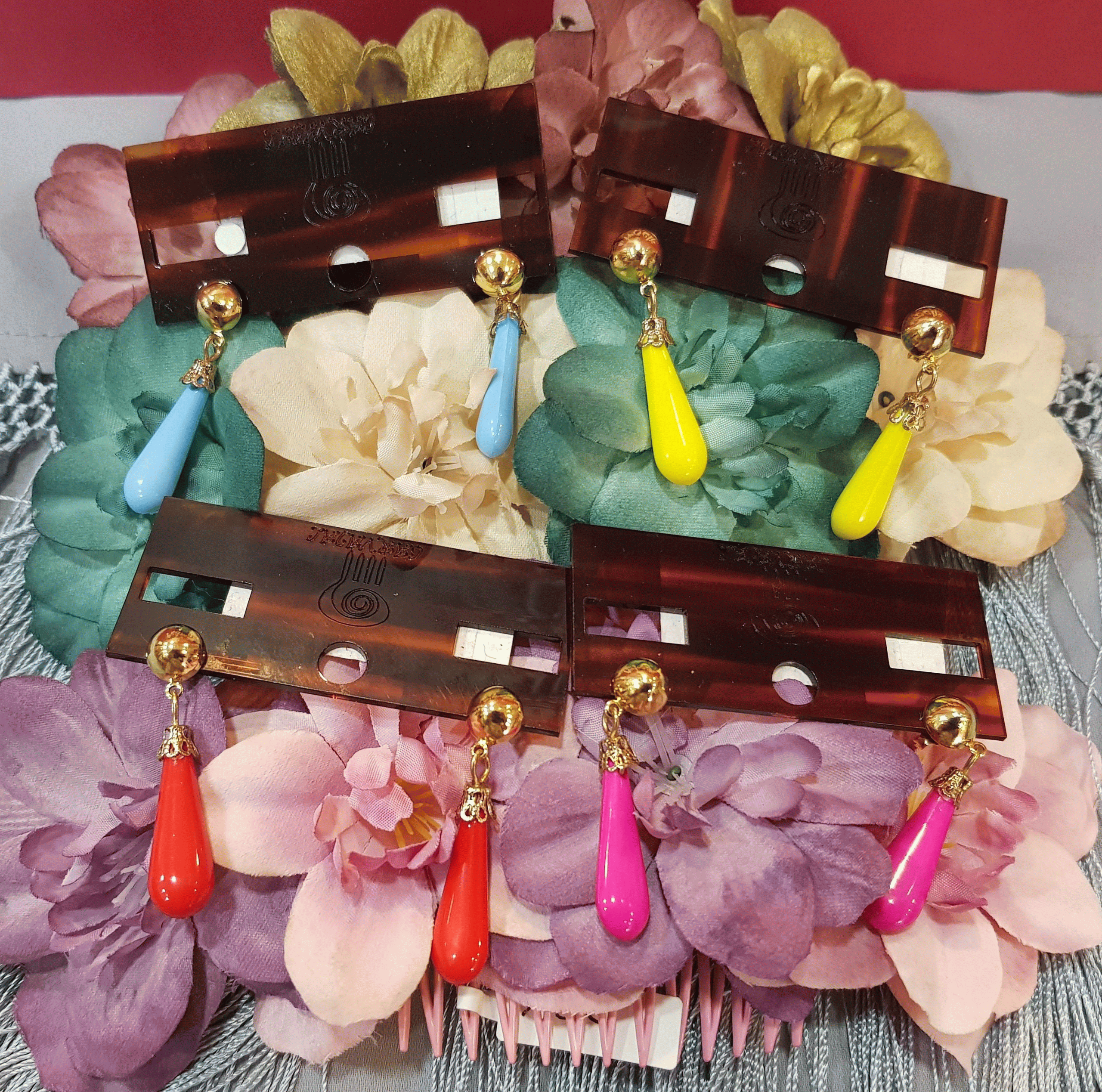 Pendiente de flamenca para niña. Fabricado en material de acetato. Forma de lagrima fina con adornos en dorado. Cierre con tuerca.