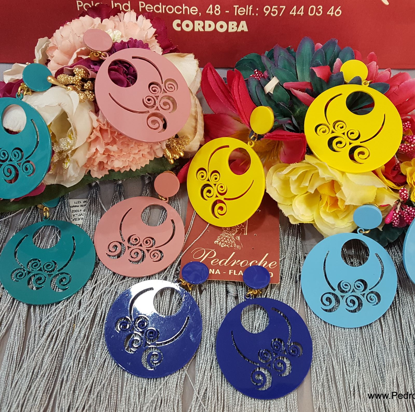 Pendiente de flamenca para niña. Fabricado en material de acetato. Forma de aro calado con dibujos de olas. Cierre omega.