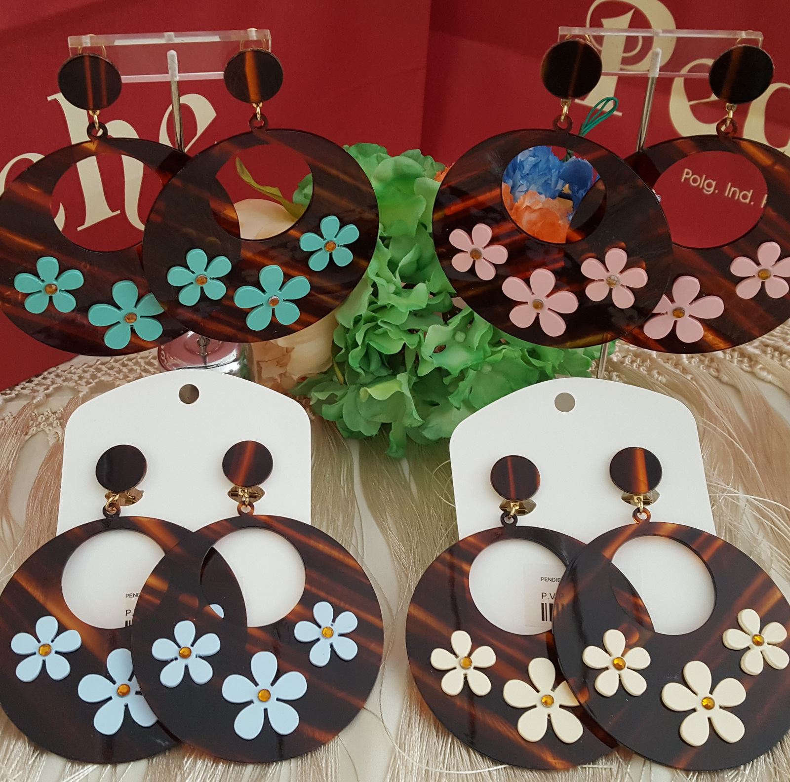 Pendiente Modelo Aro en carey. Adornado con tres flores en acetato.