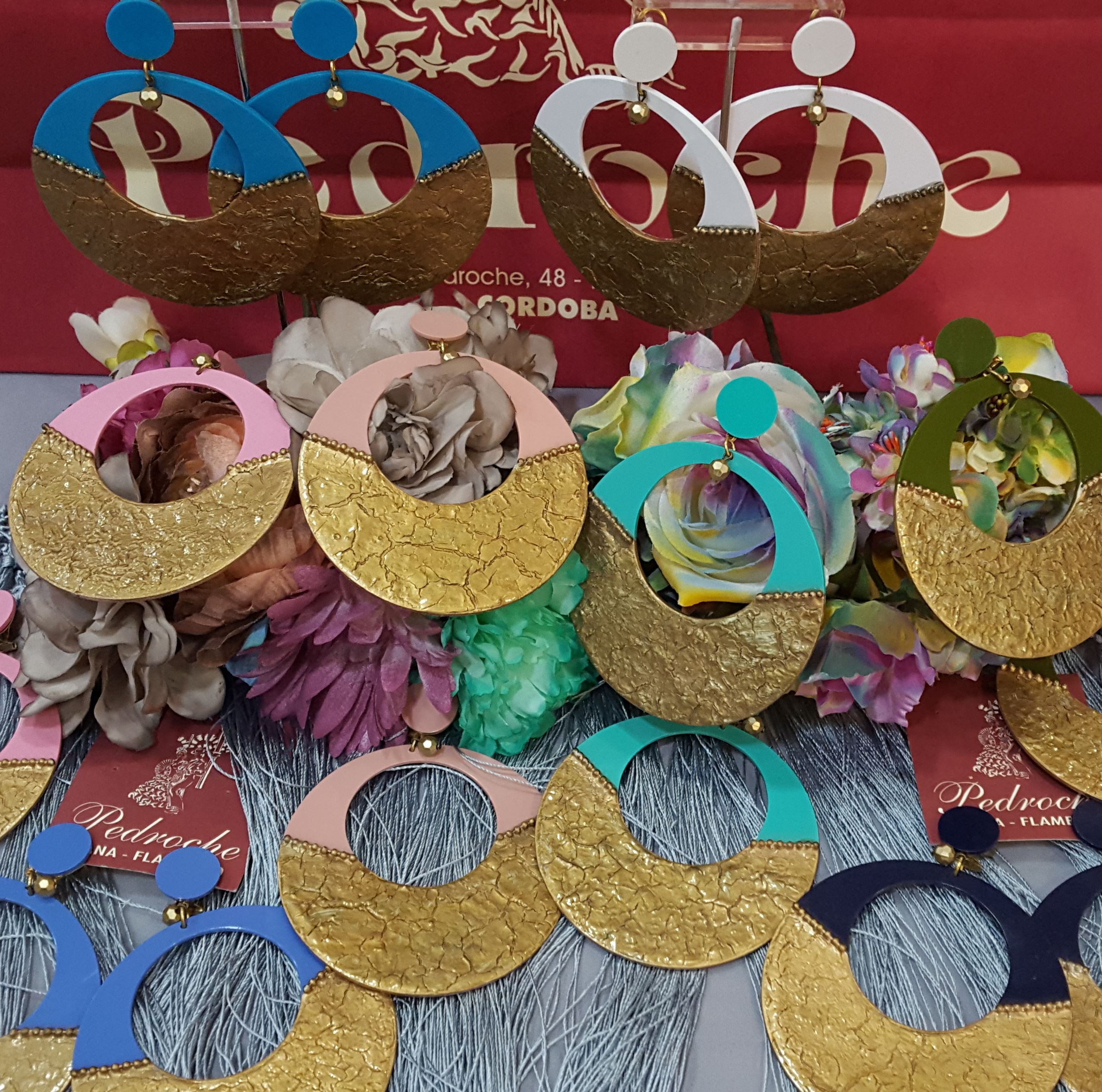 Pendiente Modelo Aro acetato con adorno craquelado en dorado.