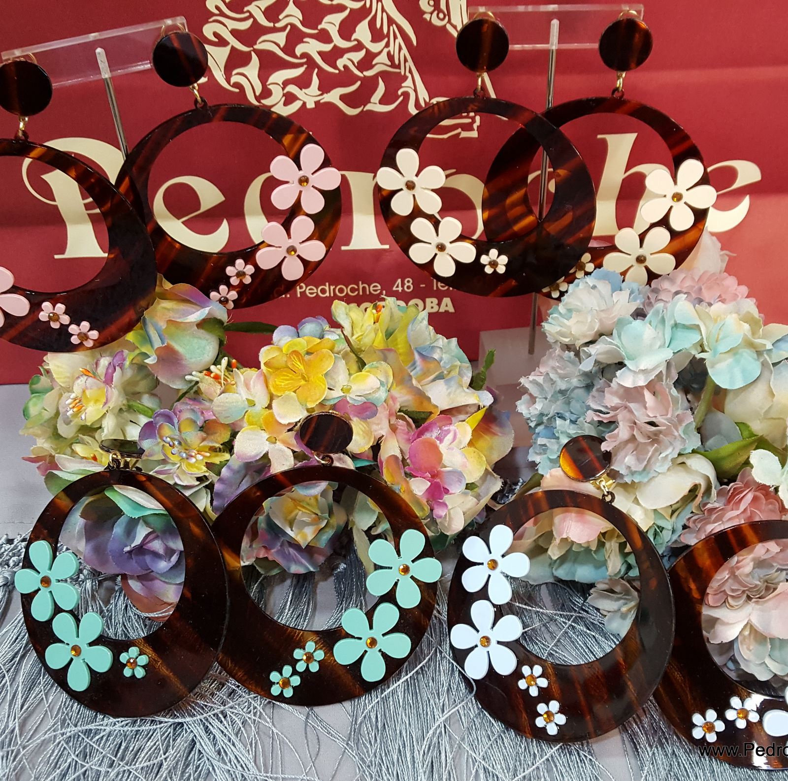 Pendiente Modelo Aro fino en carey. Adornado con cuatro flores en acetato.