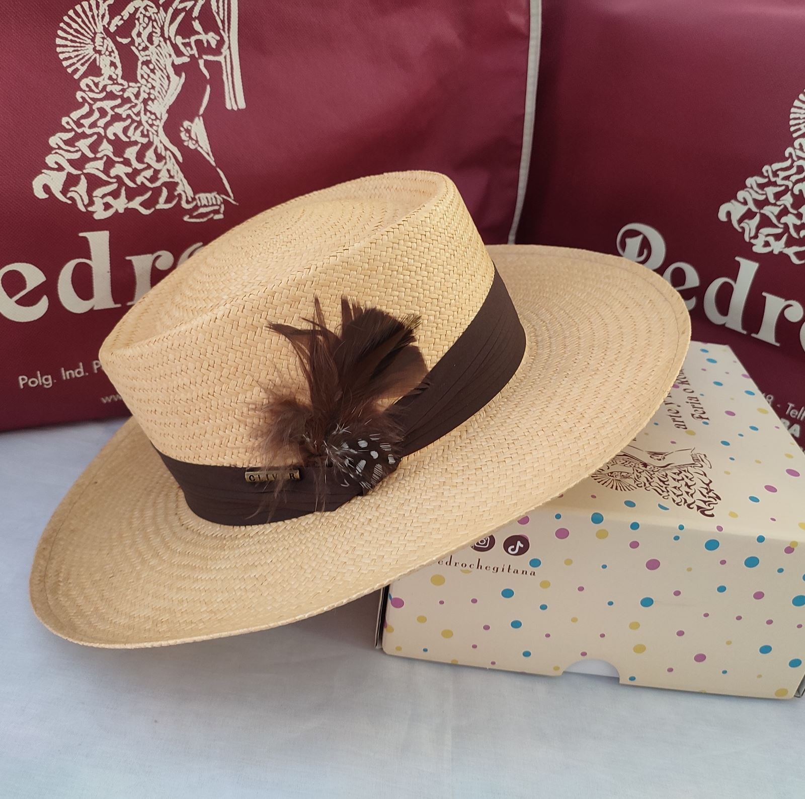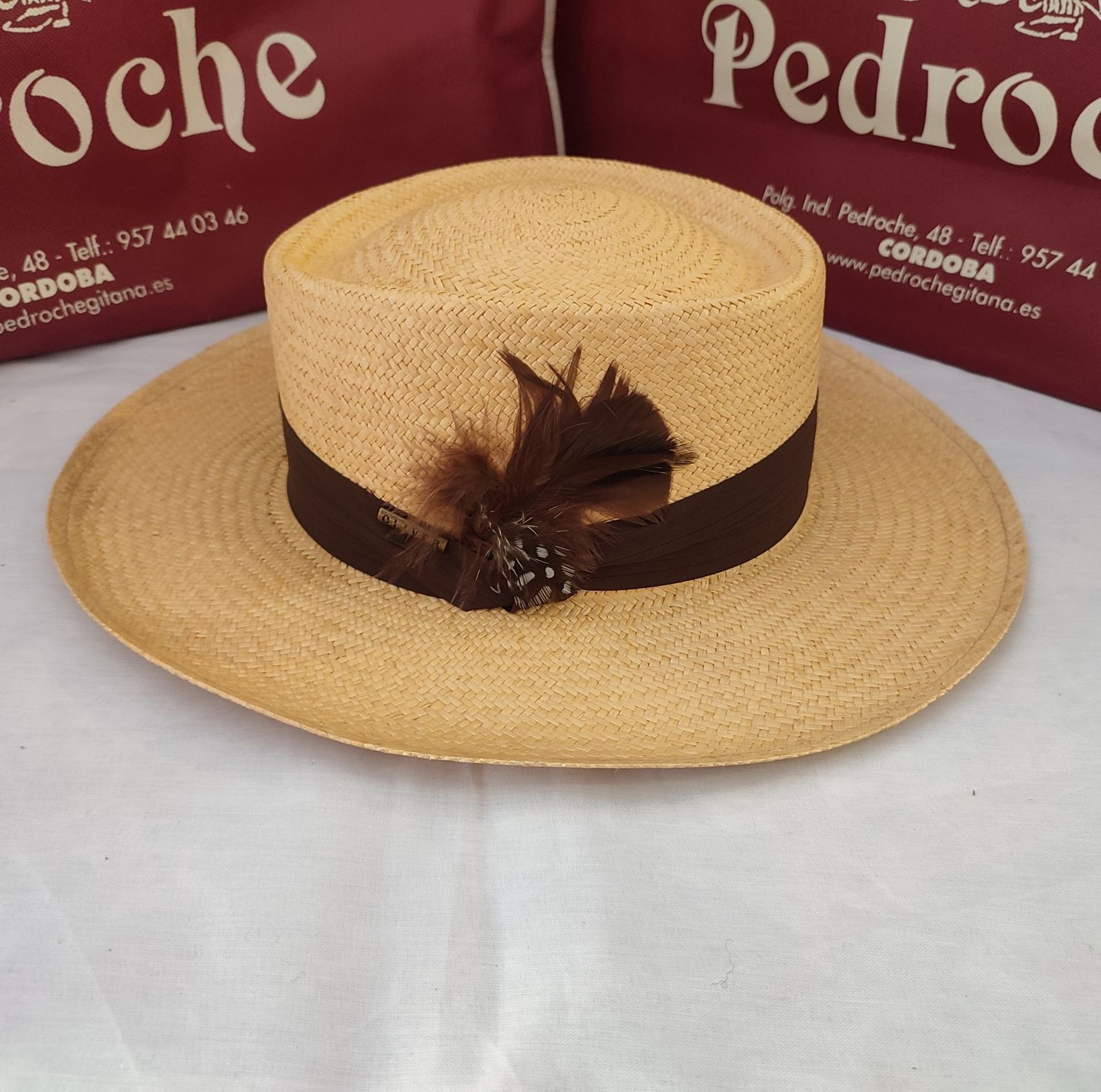Color camel con cinta en color marron y adorno de pluma.