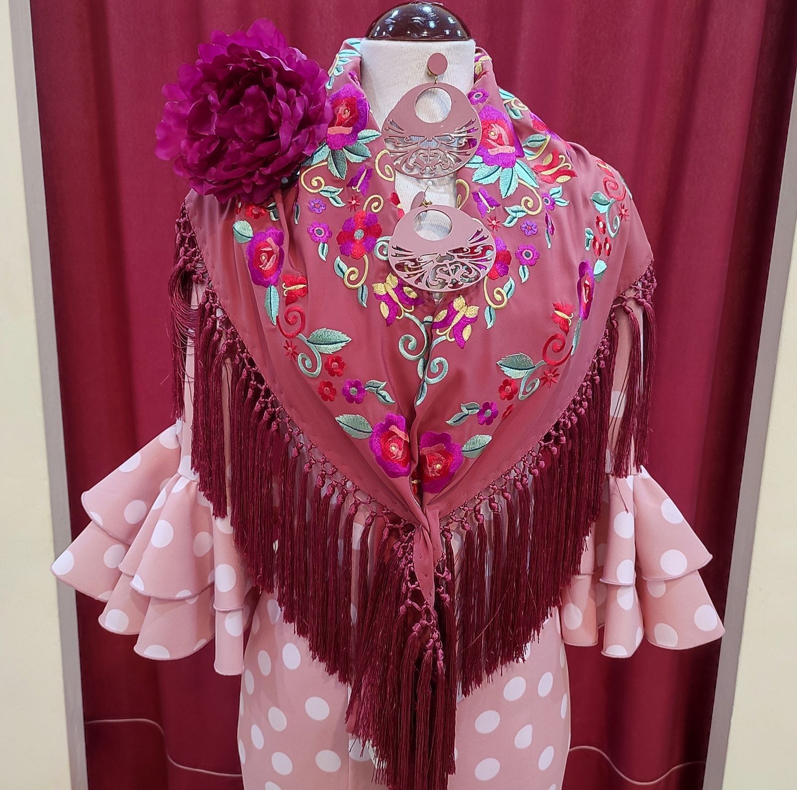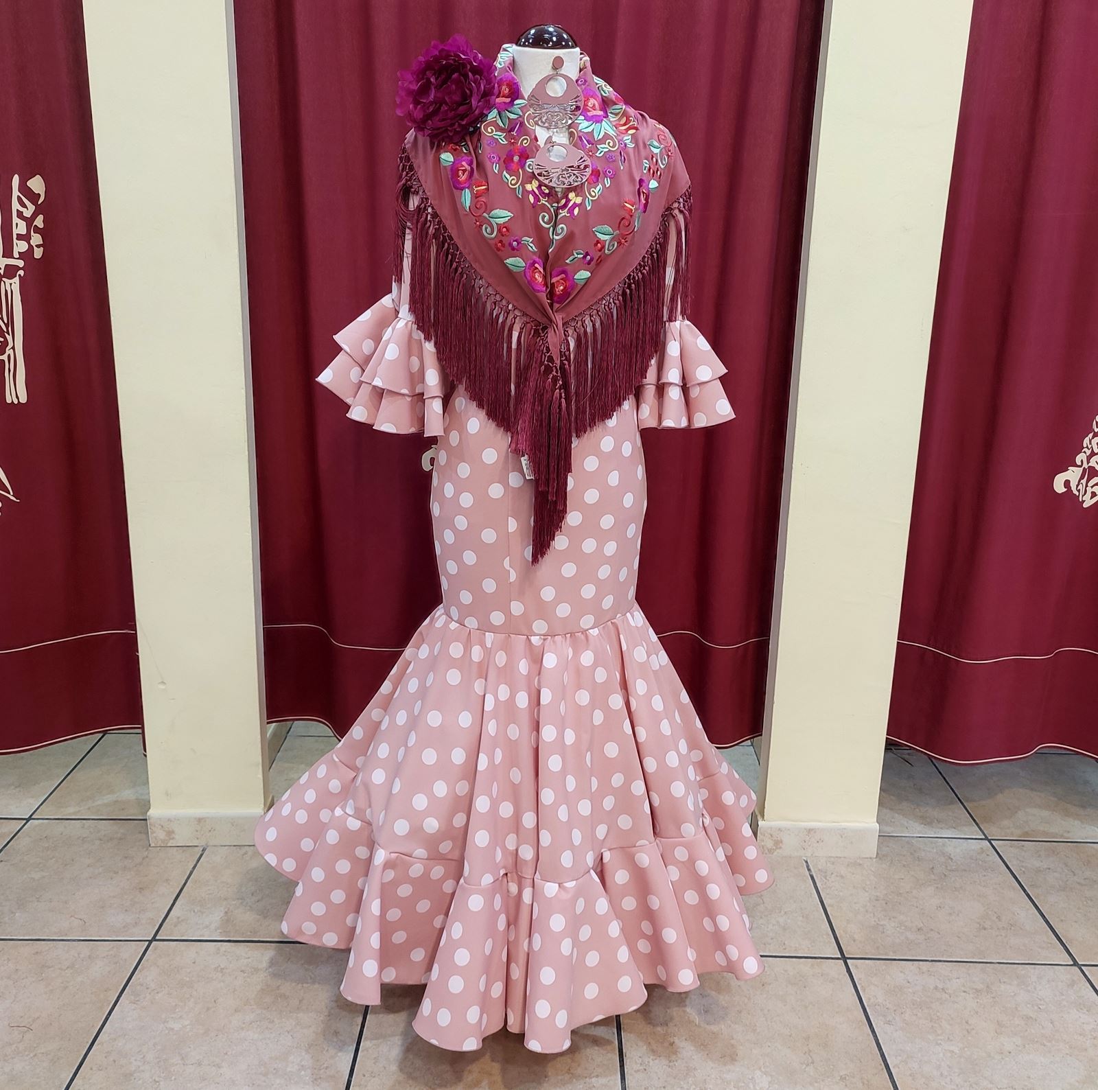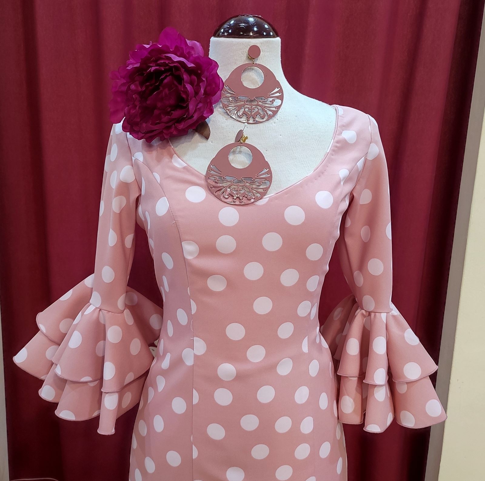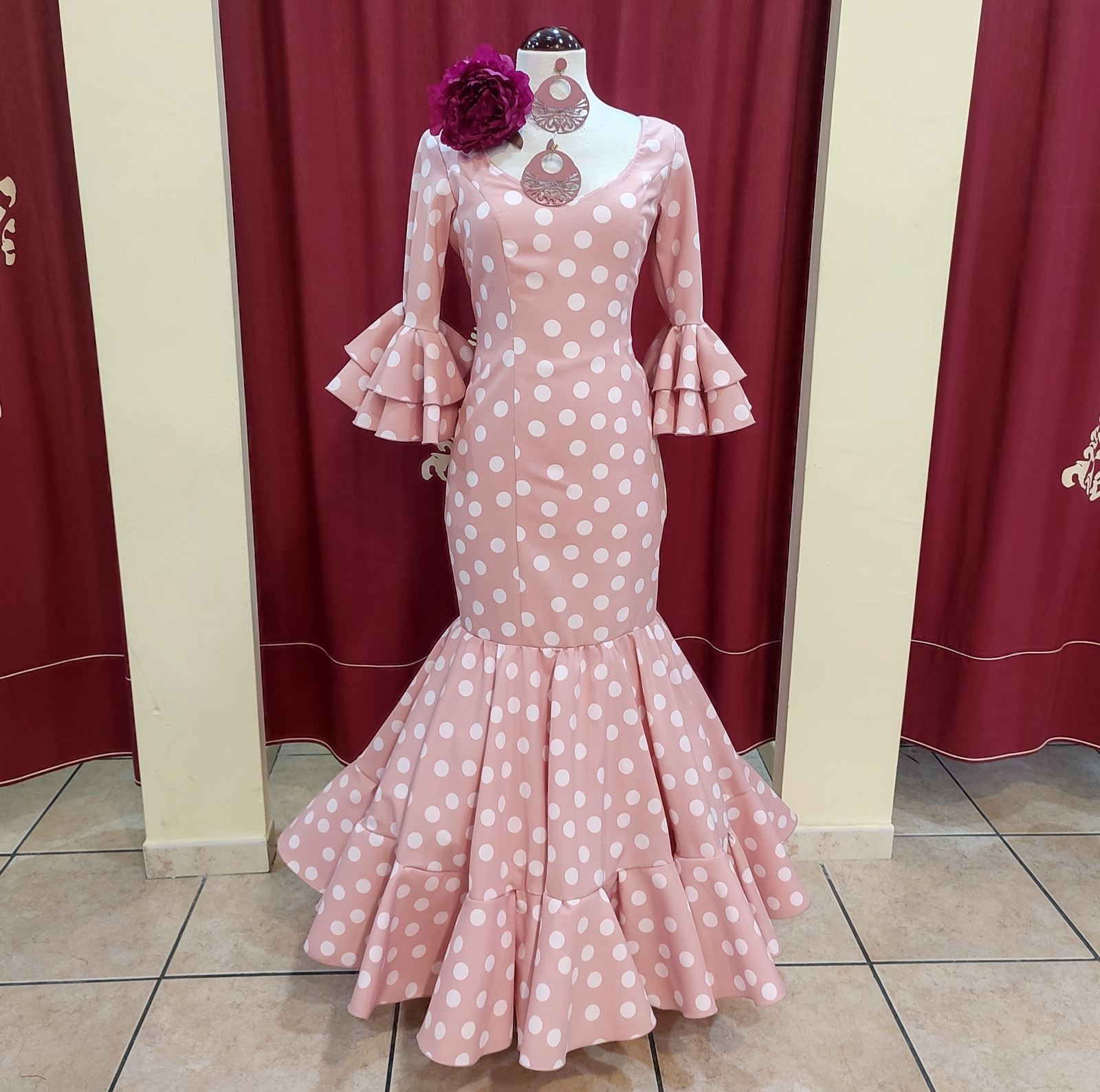 Traje de flamenca para señora. Vestido de gitana confeccionado en tejido de strech. Color rosa nude con lunares en blanco. Diseño canastero con un volante.