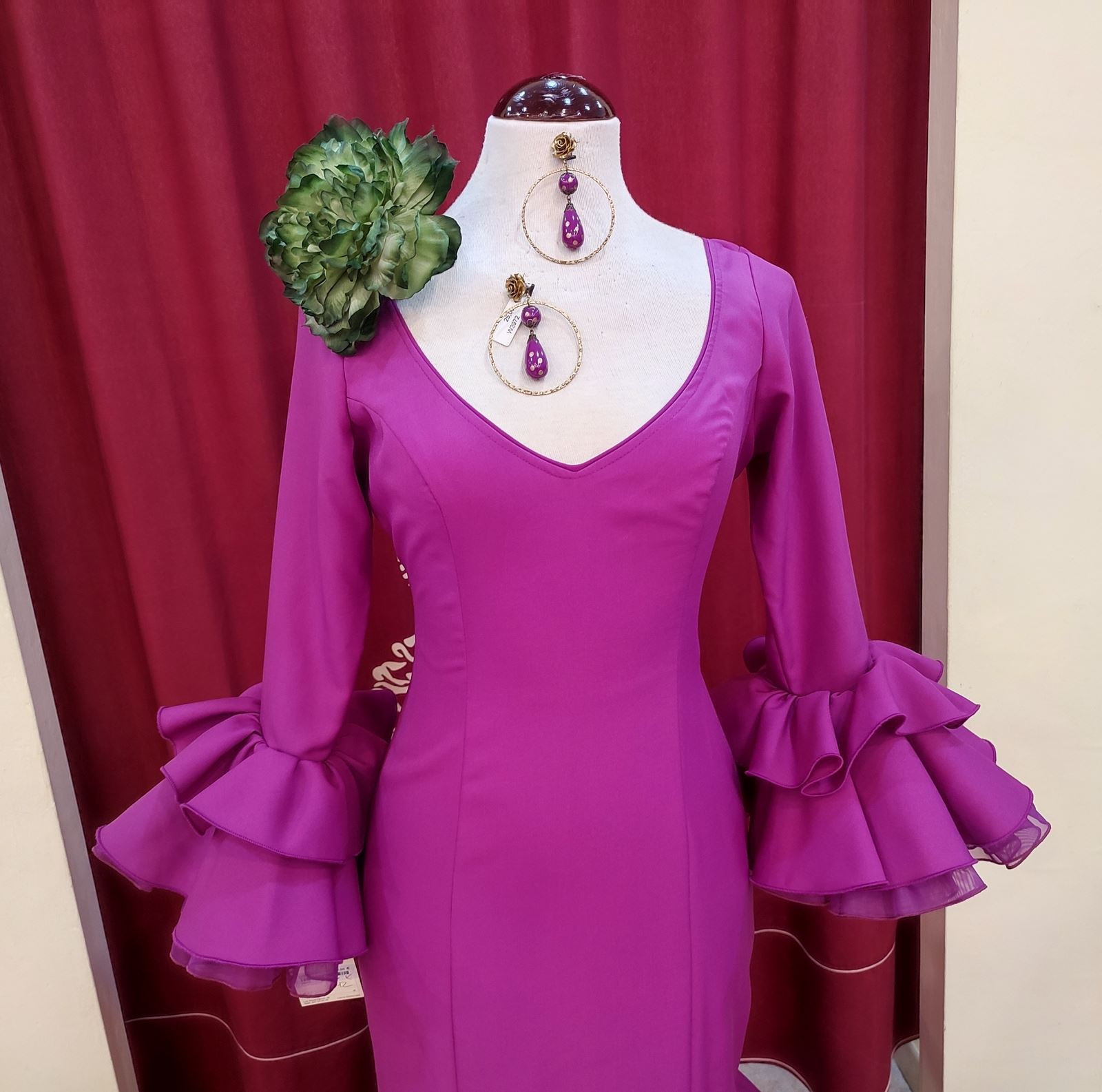 Traje de flamenca para señora. Vestido de flamenca confeccionado en tejido de strech. Color buganvilla. Diseño con extra volumen de dos volantes. Bajo volante y enaguas de organdil.