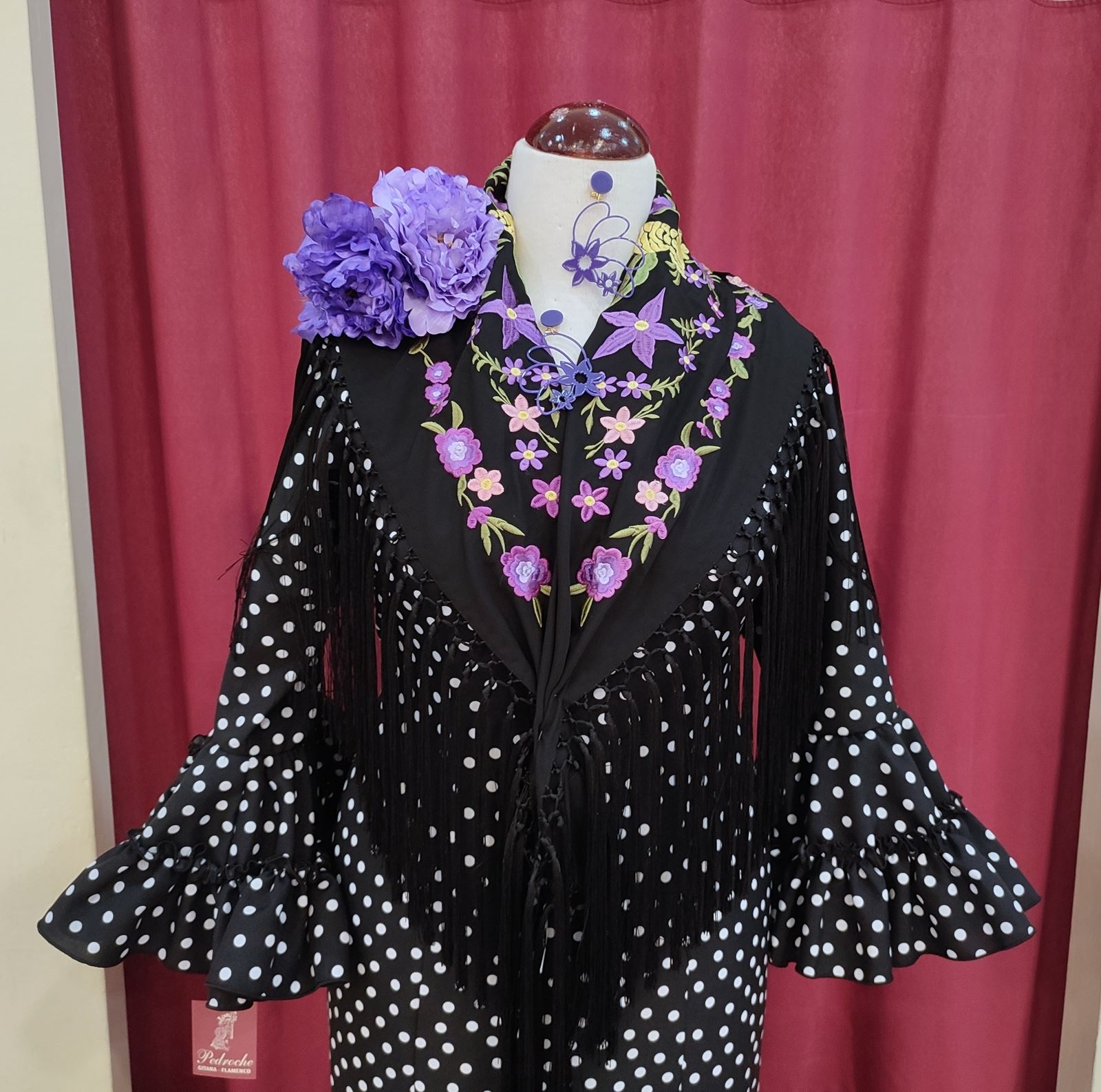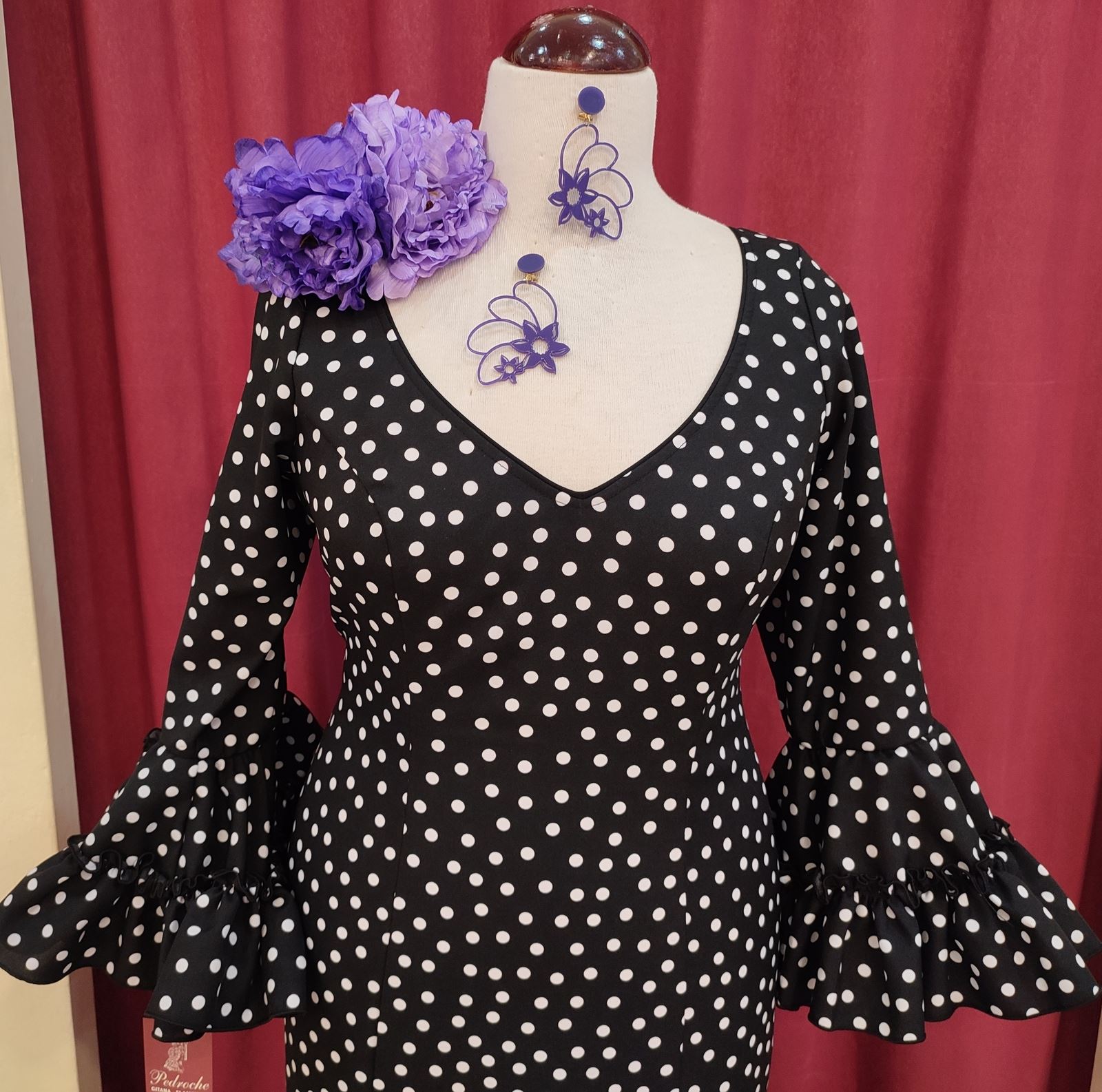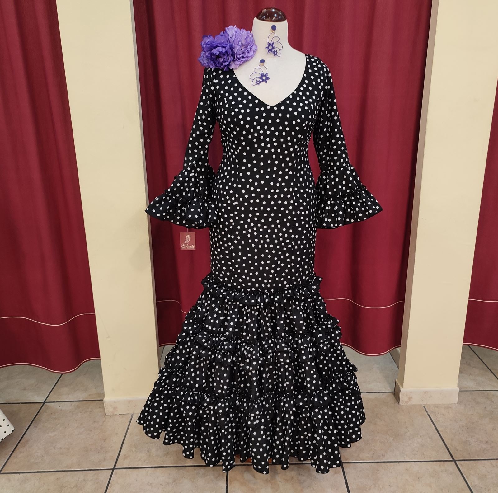 Vestido de flamenca confeccionado en tela de strech en color negro con lunar blanco.
