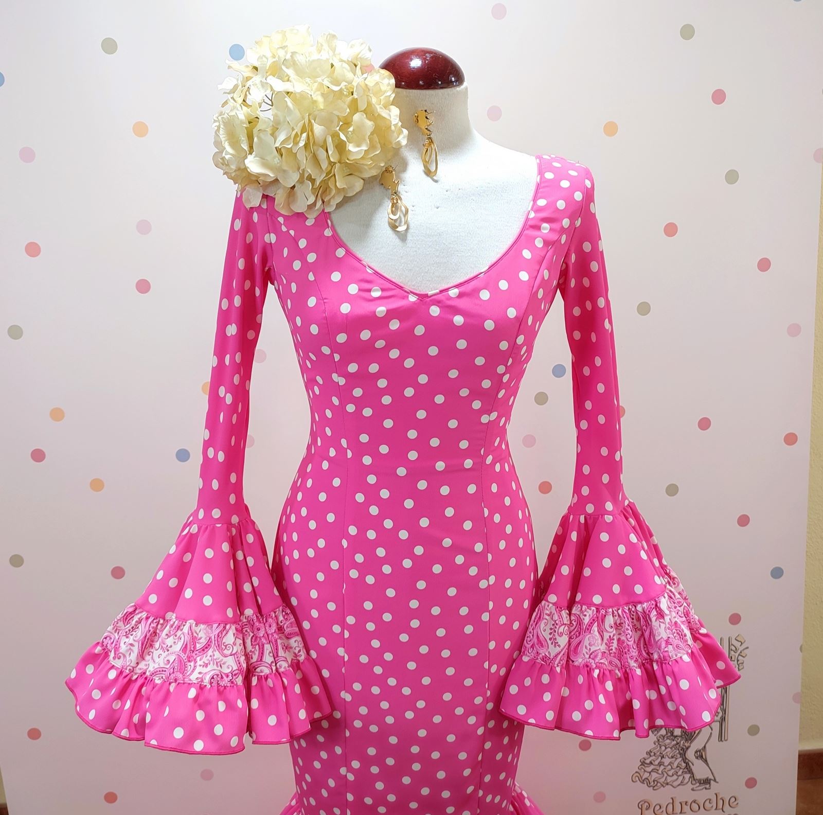 Color fucsia con lunares en beige. Cortes en estampado.