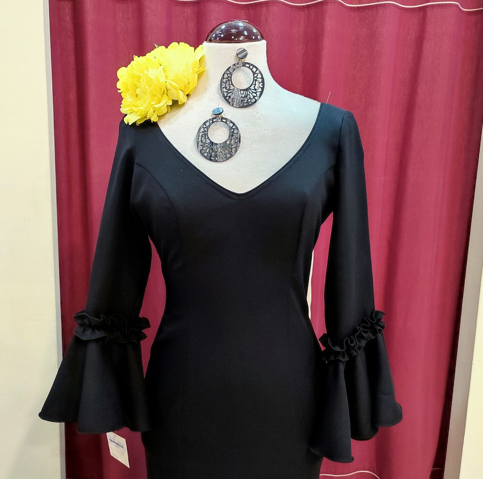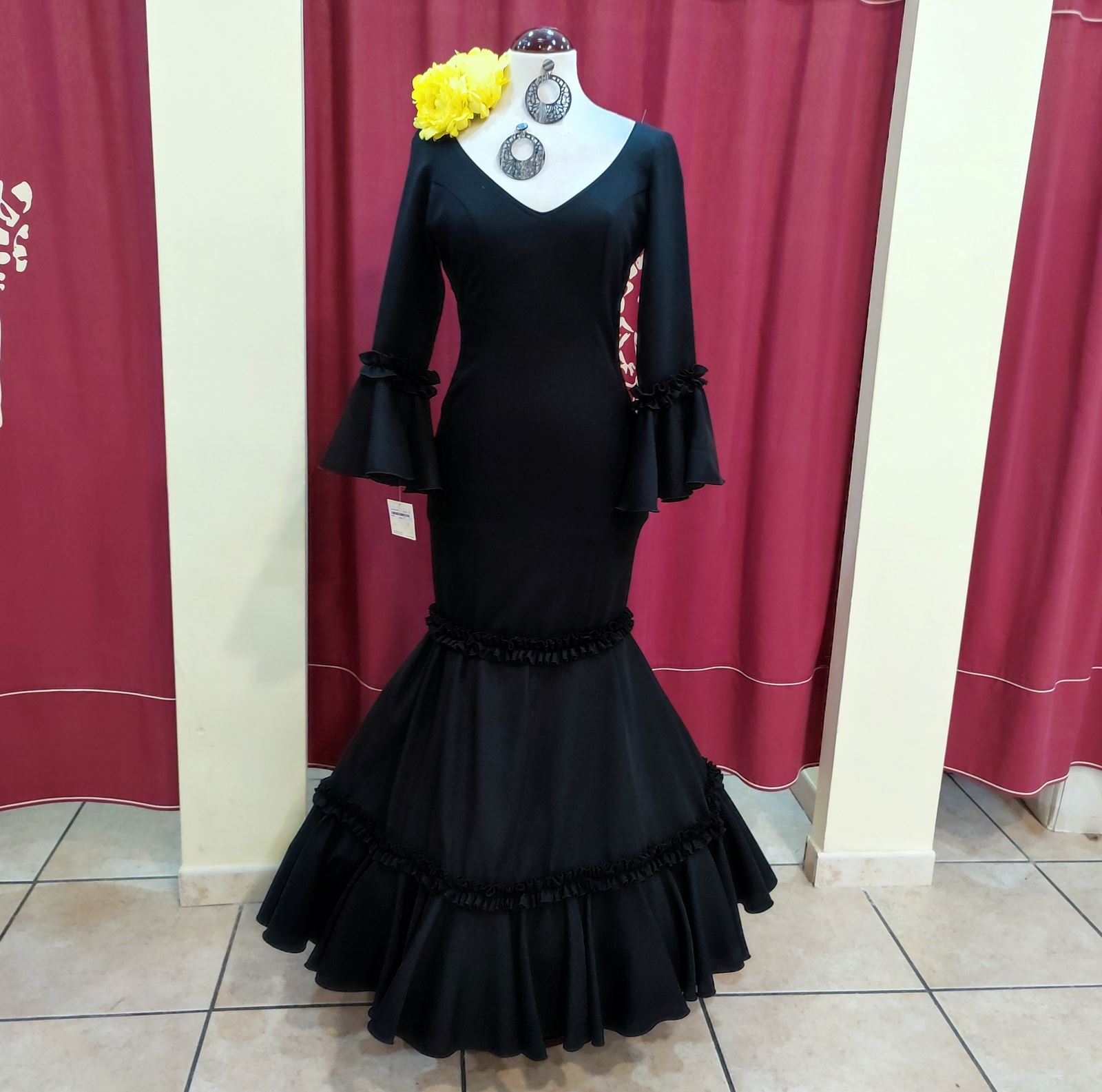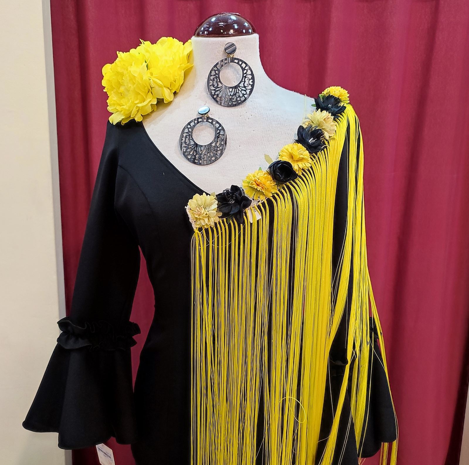 Traje de diseño canastero con tiras de garruchas en falda y mangas.