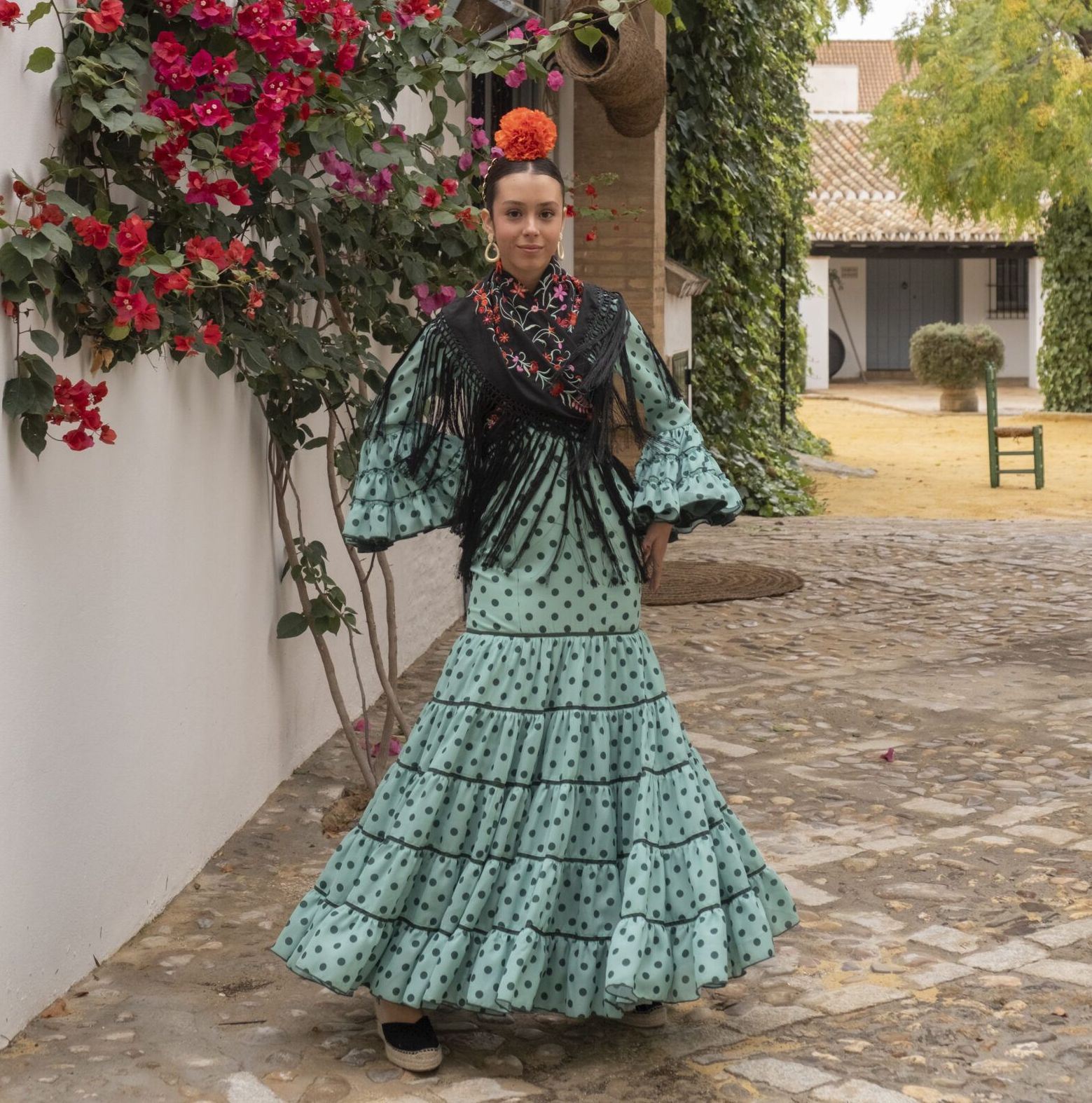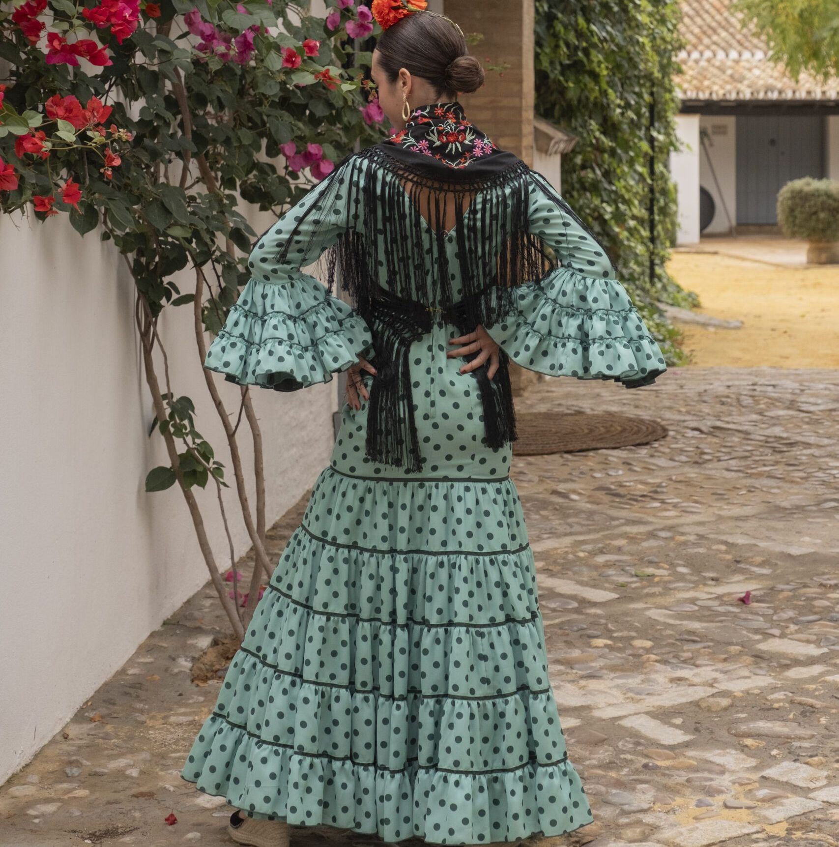 Traje estilo canastero con volantes.