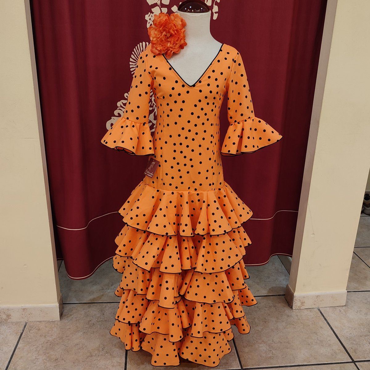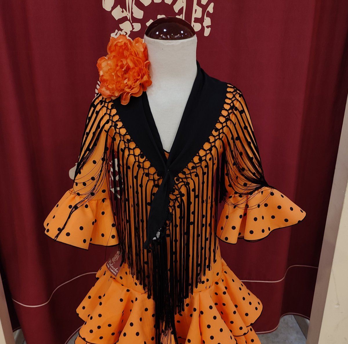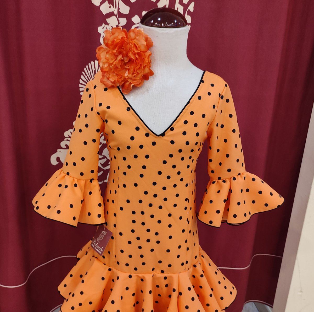 Vestido de flamenca largo para niña. Confeccionado en tela de strech color mandarina lunar negro.