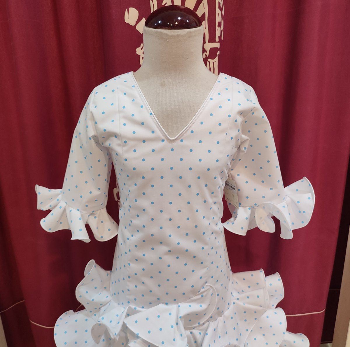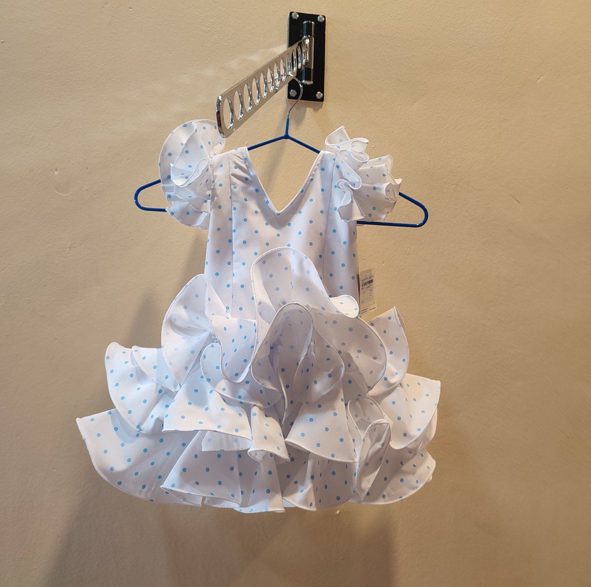 Vestido de flamenca corto confeccionado en tela de popelin blanco con lunar celeste.