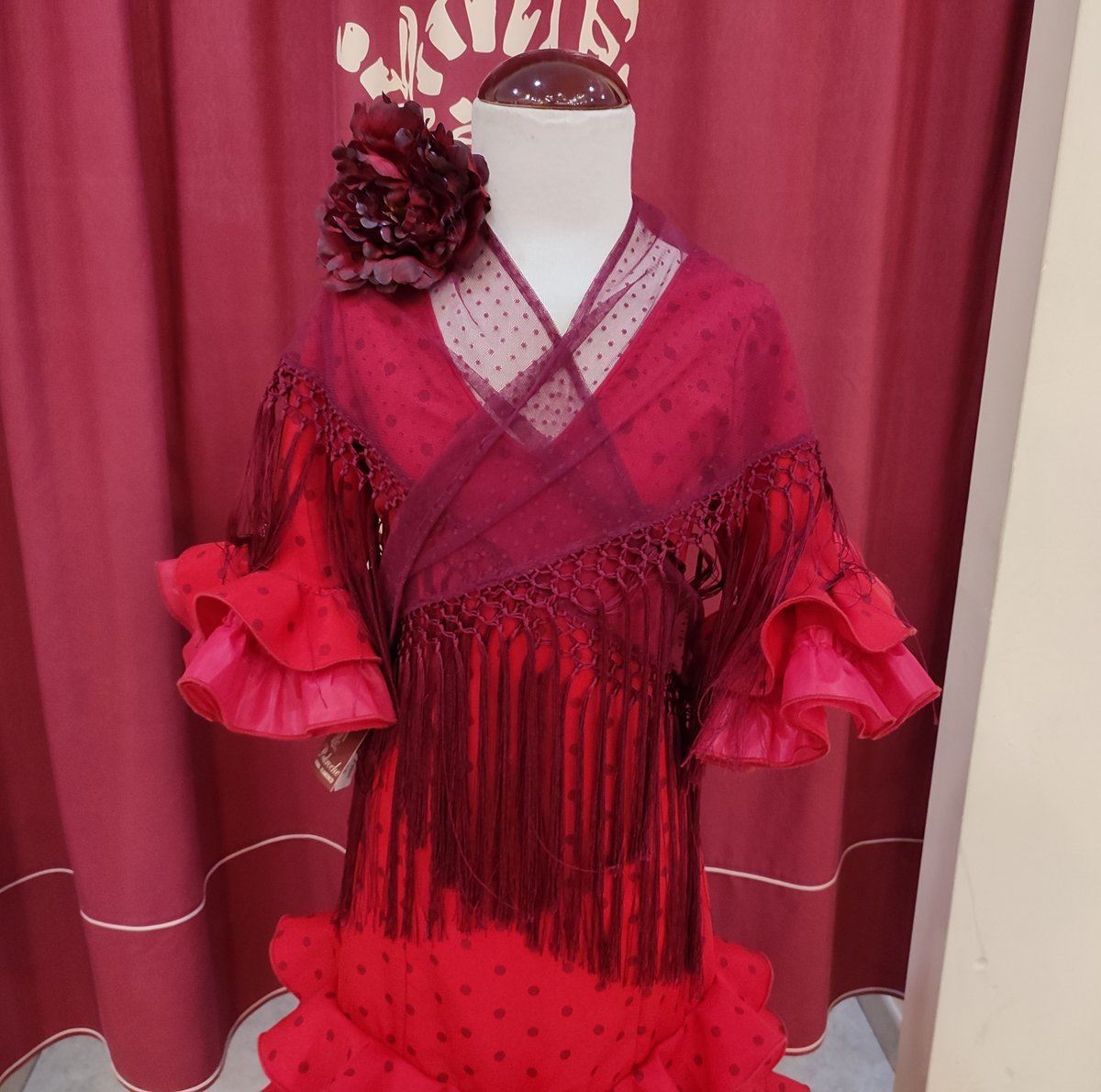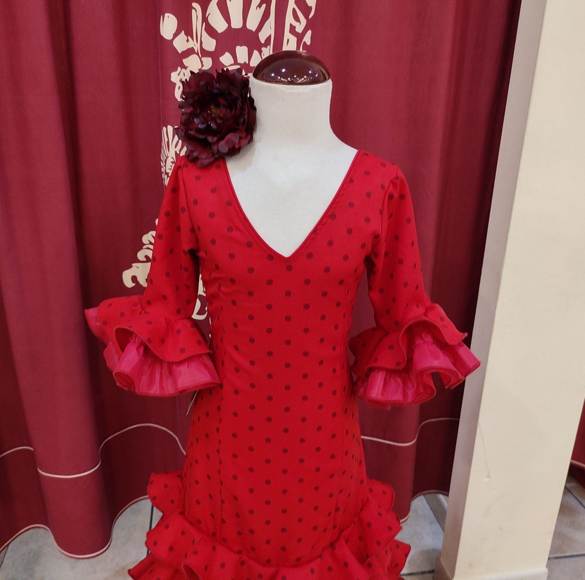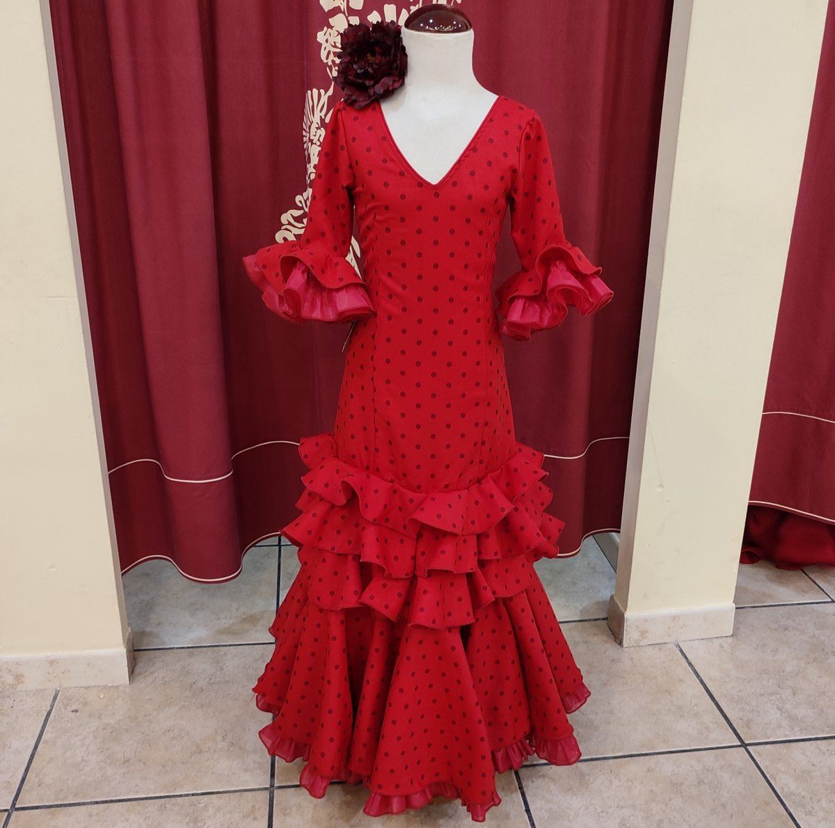 Vestido de flamenca largo para niña.Confeccionado en tela de strech color rojo con lunar granate.