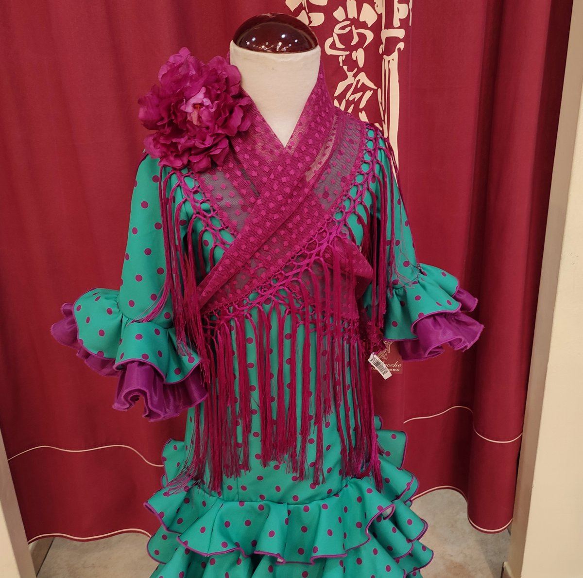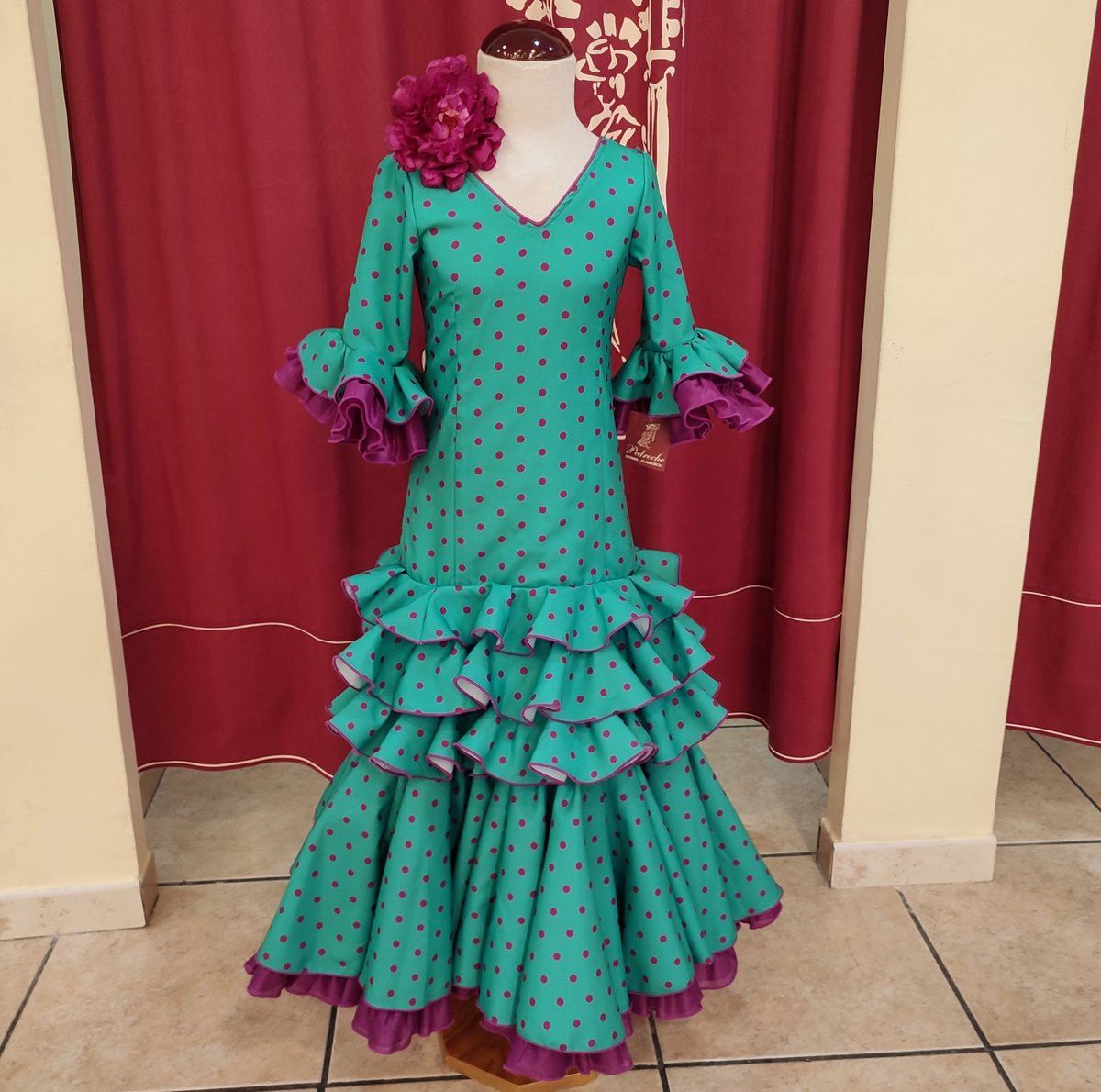 Vestido de flamenca largo para niña. Confeccionado en tela de strech color verde esmeralda con lunar buganvilla.