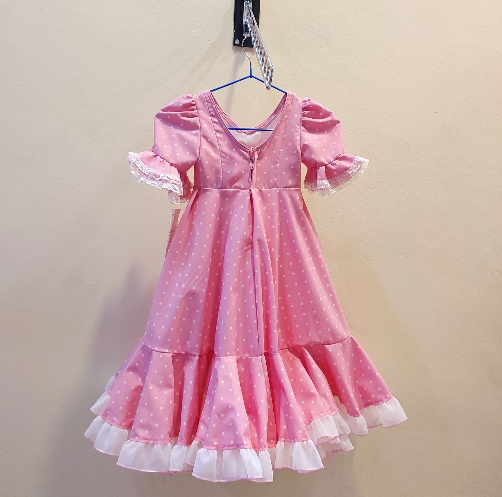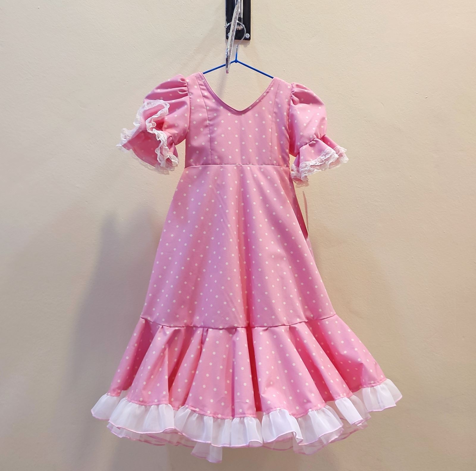 Color rosa bebe con lunares en beige. Cortes de volantes en organdil beige.